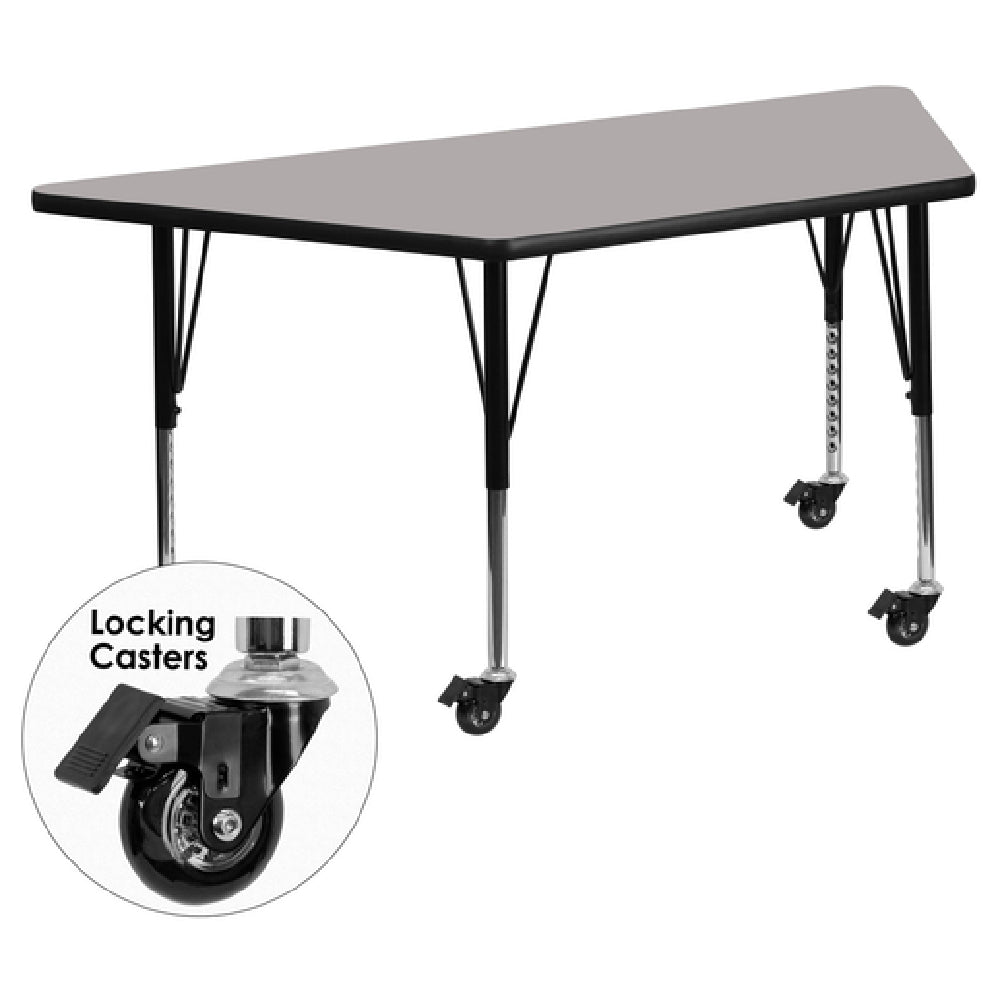 Flash Furniture XU-A2448-TRAP-GY-H-P-CAS-GG Activity Table is an innovative piece designed to cater to diverse educational and professional environments. This table measures 46-1/4 inches wide by 25-1/2 inches deep and features an adjustable height ranging from 17-1/2 inches to 25-1/2 inches, allowing flexibility to accommodate various activities and user preferences. Its distinctive trapezoid shape is complemented by a 1-1/4 inch thick high-pressure gray laminate top, which is engineered to be both scratch and stain-resistant, ensuring durability and ease of maintenance. The table's edges are protected by a black edge band, adding to its longevity and sleek appearance. Built with 16-gauge tubular steel legs, the upper legs boast a black powder-coated finish, while the chrome lower legs provide a modern touch. The inclusion of locking casters enhances mobility, making it easy to rearrange spaces or store the table when not in use. This product requires assembly and is conveniently shipped in two boxes, with in-stock items typically dispatched within 24 hours. The Flash Furniture XU-A2448-TRAP-GY-H-P-CAS-GG Activity Table is a versatile solution for classrooms, offices, and collaborative workspaces, offering both aesthetic appeal and functional adaptability.