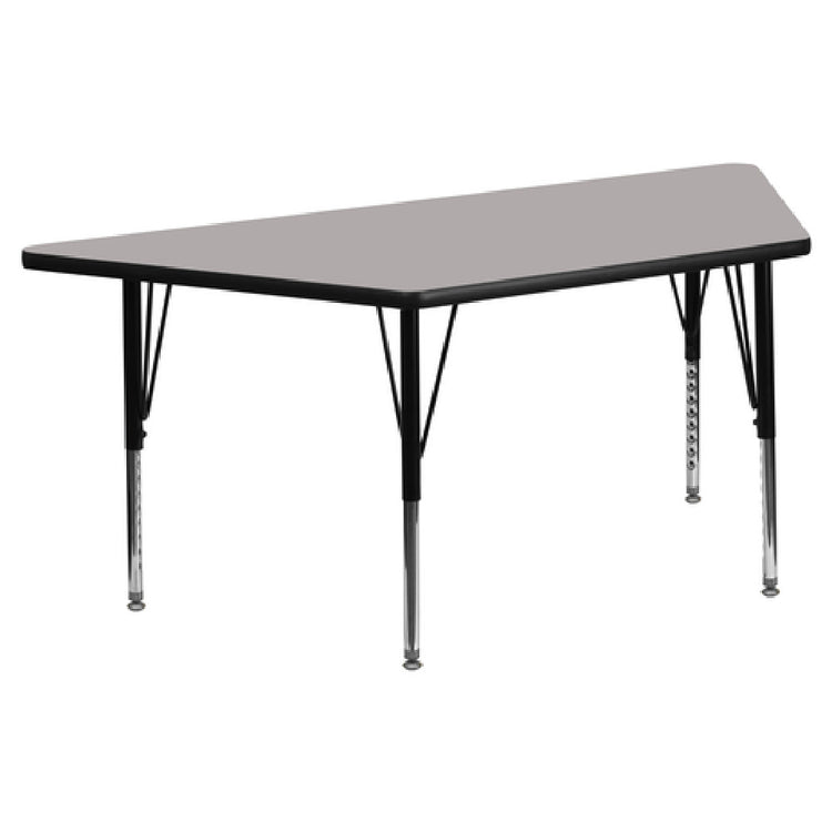 The Flash Furniture XU-A2448-TRAP-GY-H-P-GG Activity Table is a versatile piece designed to meet diverse user needs across educational and professional environments. Measuring 46-1/4 inches in width and 25-1/2 inches in depth, this table features an adjustable height ranging from 16-1/4 inches to 25-1/4 inches, allowing it to cater to users of different ages and preferences. The trapezoid-shaped table boasts a 1-1/4 inch thick high-pressure gray laminate top, known for its durability and resistance to scratches and stains, making it an ideal choice for high-usage settings. It is supported by 16 gauge tubular steel legs, with the upper legs featuring a black powder coat and the lower legs finished in chrome, providing a sleek and modern aesthetic. The table also includes self-leveling nylon floor glides, ensuring stability and protecting floors from damage. Shipped in two boxes, the Flash Furniture Activity Table is readily available with in-stock items typically shipping within 24 hours. Its robust construction and practical design make it a valuable asset for classrooms, training rooms, and collaborative workspaces, where flexibility and durability are critical requirements.