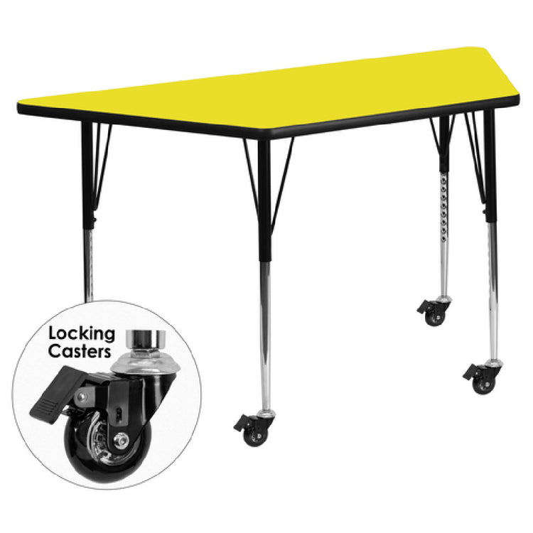 The Flash Furniture XU-A2448-TRAP-YEL-H-A-CAS-GG Activity Table is a versatile piece designed for dynamic environments such as classrooms, training facilities, and collaborative spaces. Measuring 46-1/4 inches in width and 25-1/2 inches in depth, this table features an adjustable height ranging from 22-3/8 inches to 30-1/2 inches, allowing users to customize it for various tasks and comfort levels. The table showcases a trapezoid shape with a 1-1/4 inch thick high-pressure yellow laminate top, which is both scratch and stain resistant, ensuring durability and longevity. A black edge band adds to its sleek, modern appearance. Supported by 16-gauge tubular steel legs, the table's upper legs are coated in black powder, while the lower legs are chrome-finished, providing both stability and style. Locking casters are included, offering mobility and convenience, ideal for spaces requiring frequent rearrangement. Assembly is required upon delivery, which is shipped in two boxes. Typically, in-stock items will ship within 24 hours, making it a practical choice for those needing efficient solutions. This activity table is an asset for any setting requiring adaptable, durable furniture that supports a variety of interactive and educational activities.