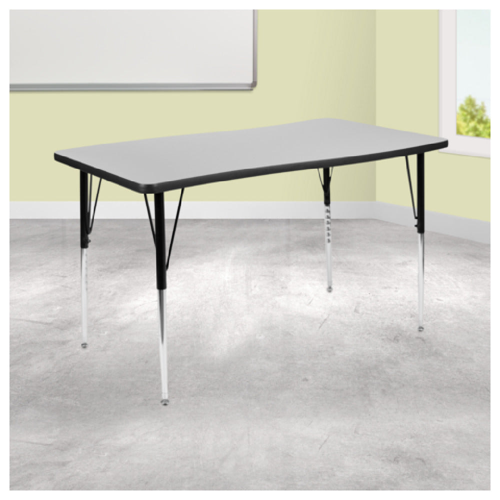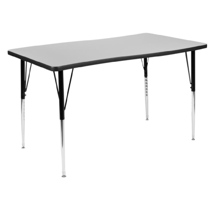 The Flash Furniture XU-A3048-CON-GY-T-A-GG Wren Activity Table is an adaptable piece designed for diverse educational and professional environments. Measuring 47-1/2 inches in width, 28 inches in depth, and adjustable in height from 21-1/4 inches to 30-1/4 inches, this table offers flexibility to accommodate users from 1st grade through adulthood. Featuring a unique rectangle wave shape, the table provides a distinctive aesthetic that enhances any space. Its nestable design makes it convenient for storage and space-saving solutions. The laminate top ensures durability and ease of cleaning, making it an ideal choice for high-traffic areas. The table is supported by robust 16-gauge tubular steel legs that guarantee stability and long-term use. Nylon floor glides are incorporated to protect floors and offer smooth movement, making rearrangement effortless. With its neutral gray finish, the Wren Activity Table fits seamlessly into various color schemes and settings. Whether utilized in a classroom, conference room, or training facility, this table's versatile design supports a wide range of activities and needs, demonstrating its value across multiple segment markets within the furniture industry.