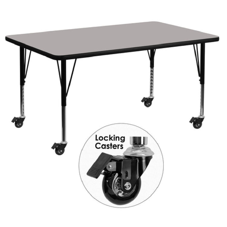 The Flash Furniture XU-A3060-REC-GY-H-P-CAS-GG Activity Table is a versatile and durable table designed for various educational and professional environments. Measuring 60"W x 30"D, it features a height-adjustable range from 17-1/2" to 25-1/2", allowing customization for different user needs and settings. The table's rectangular top is made from a 1-1/4" thick high-pressure gray laminate, providing a scratch and stain resistant surface that ensures longevity and easy maintenance. It is reinforced with a black edge band for additional durability. The table's robust 16 gauge tubular steel legs are designed with black powder-coated upper segments and chrome lower segments, offering both stability and a sleek appearance. Locking casters provide effortless mobility, making it easy to reposition the table as needed, while ensuring it stays securely in place during use. Assembly is required for this product, which is conveniently shipped in two boxes. Typically, in-stock items are dispatched within 24 hours, ensuring prompt delivery. This activity table is an excellent choice for classrooms, training facilities, and collaborative workspaces, offering a reliable and adaptable solution for dynamic environments.