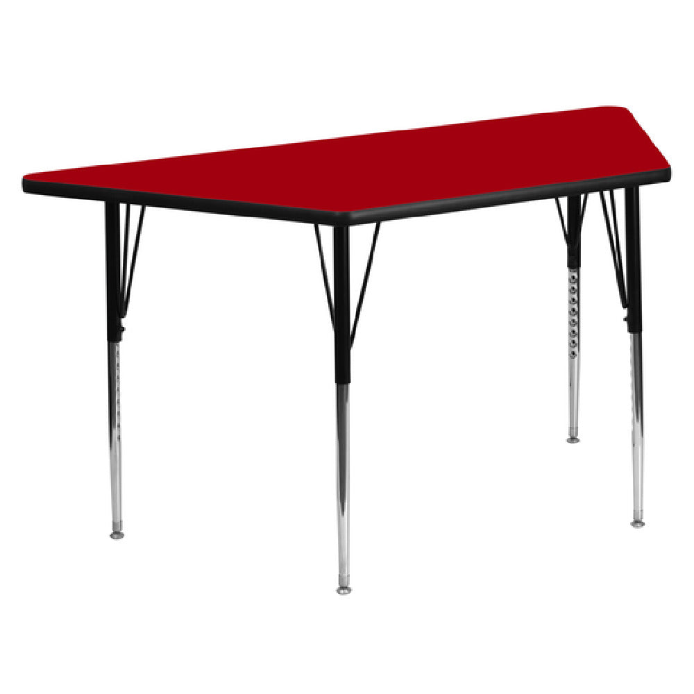 Flash Furniture XU-A3060-TRAP-RED-T-A-GG Activity Table is a versatile piece ideally suited for educational and creative environments. Its dimensions of 57-1/2"W x 26-1/4"D provide ample workspace, while the adjustable height range of 21-1/8" to 30-1/8" ensures adaptability to different user needs, making it suitable for various age groups and activities. The trapezoid shape of this table allows for unique and flexible seating arrangements, promoting collaborative work in classrooms and training sessions. The table's 1-1/8" thick thermal fused red laminate top not only adds a vibrant touch but also offers a scratch and stain-resistant surface, ensuring durability and easy maintenance. The edges are protected by a black edge band, adding to the table's longevity and aesthetic appeal. Supported by 16-gauge tubular steel legs, the table boasts stability and strength, with a black powder-coated finish on the upper legs and chrome on the lower legs for a sleek look. Equipped with self-leveling nylon floor glides, this activity table provides stability on uneven surfaces. Shipped in 2 boxes, the product is readily available with in-stock items typically dispatched within 24 hours, catering to the immediate needs of educational institutions and creative spaces.