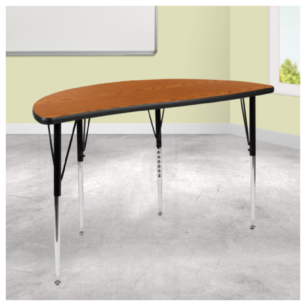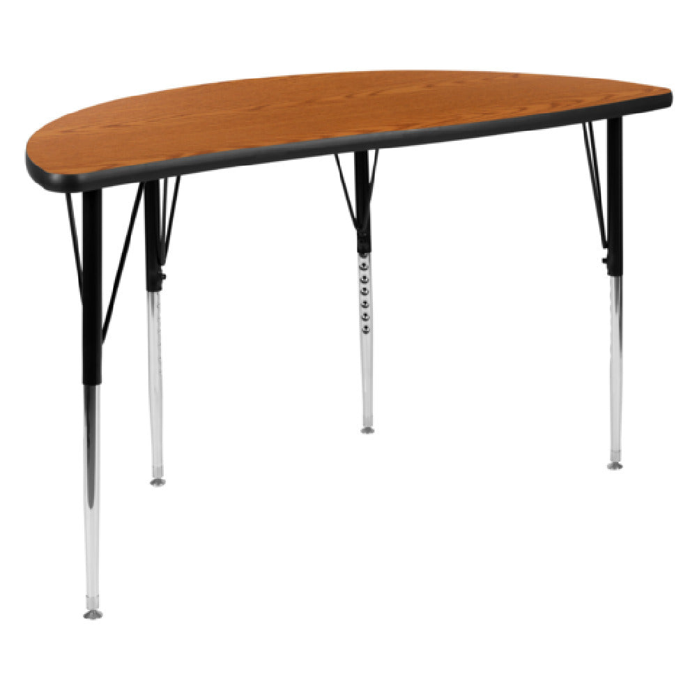 Flash Furniture XU-A48-HCIRC-OAK-T-A-GG Activity Table 47-1/2"W X 24"D X 21-1/4" To 30-1/4" Adjustable Height is a versatile and durable piece designed to meet the diverse needs of educational, corporate, and home settings. This activity table features a half circle wave design, which adds a unique aesthetic to any environment. The table is equipped with a 1" thick thermal fused oak laminate top that provides a scratch and stain resistant surface, ensuring long-lasting use. Its dimensions of 47-1/2"W x 24"D allow for ample workspace, while the adjustable height range from 21-1/4" to 30-1/4" caters to different user preferences and ergonomic needs. The black edge band adds a sleek finish to the table, enhancing its visual appeal. Supported by 16 gauge tubular steel legs, the table is both sturdy and stable. The black powder coated upper legs contrast with the chrome lower legs, offering a modern look. Additionally, self-leveling floor glides are included to accommodate uneven surfaces, ensuring stability. Conveniently shipped in two boxes, this table is in stock and usually ships within 24 hours, making it a practical choice for a variety of industries requiring functional and adaptable furniture solutions.