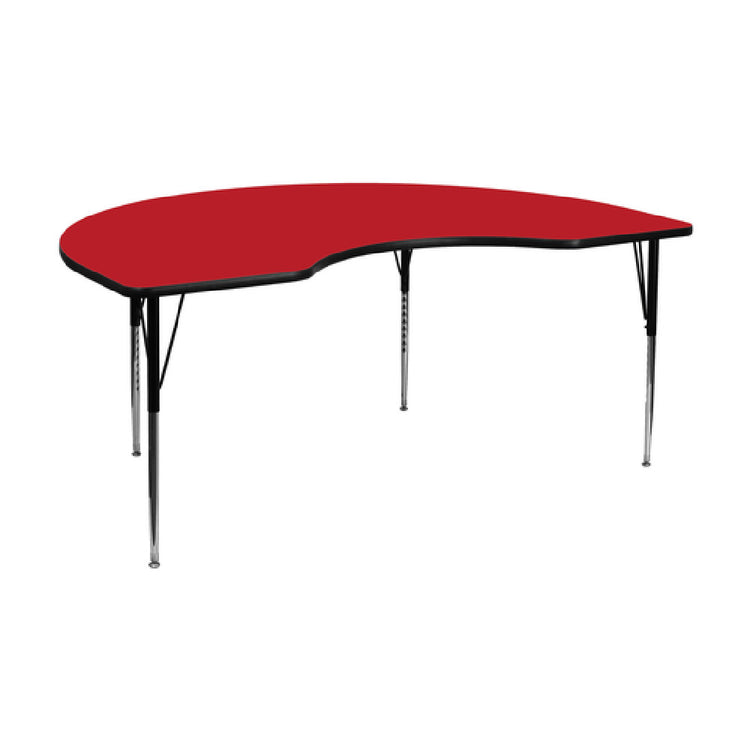The Flash Furniture XU-A4872-KIDNY-RED-H-A-GG Activity Table is a versatile piece designed to meet the needs of various educational and professional environments. Measuring 72"W x 48"D, this kidney-shaped table stands out with its adjustable height feature, ranging from 21-1/4" to 30-1/4", catering to different seating arrangements and user requirements. The table's top is crafted from a 1-1/4" thick high-pressure red laminate, providing a vibrant and durable surface that resists scratches and stains, ensuring longevity in high-traffic areas. The black edge band complements the table's aesthetic while adding an extra layer of protection. Supported by 16 gauge tubular steel legs, the table's stability is further enhanced by black powder-coated upper legs and chrome lower legs, combining strength with a sleek appearance. Self-leveling floor glides are included, allowing the table to adapt to uneven surfaces and maintain a balanced stance. This product is shipped in two boxes, streamlining the delivery process. Ideal for classrooms, training rooms, and collaborative spaces, the Flash Furniture Activity Table offers a practical and durable solution for a variety of settings, featuring robust construction and functional design to support diverse activities and needs.