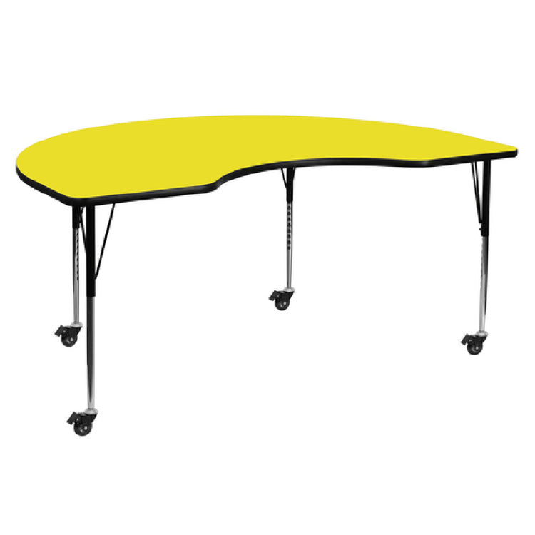 The Flash Furniture XU-A4872-KIDNY-YEL-H-A-CAS-GG Activity Table is a versatile and adjustable-height table designed to cater to a wide range of educational and professional environments. With dimensions of 72"W x 48"D and an adjustable height ranging from 22-2/5" to 30-1/2", this table offers flexibility to accommodate various age groups and seating arrangements. Its kidney shape enhances collaborative interactions and optimizes space utilization. The table features a 1-1/4" thick high-pressure yellow laminate top that is both scratch and stain-resistant, ensuring durability and longevity in high-traffic areas. A black edge band frames the top, adding a sleek contrast to its vibrant surface. Supported by 16-gauge tubular steel legs, the table boasts a sturdy foundation, with black powder-coated upper legs and chrome lower legs for added stability and aesthetic appeal. Locking casters provide mobility and ease of rearrangement, making it a practical choice for dynamic settings. Please note that assembly is required, and the product is shipped in two boxes, with in-stock items typically dispatched within 24 hours. This activity table is ideal for classrooms, training rooms, and collaborative workspaces where adaptability and durability are paramount.