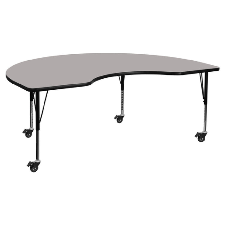 The Flash Furniture XU-A4896-KIDNY-GY-H-P-CAS-GG Activity Table is designed to cater to diverse needs across various industry segments with its unique specifications. This table features a kidney-shaped design, measuring 96 inches in width and 48 inches in depth, providing ample workspace for collaborative activities. The adjustable height feature ranges from 17-1/2 inches to 25-1/2 inches, accommodating users of different ages and height requirements, making it suitable for educational institutions, training facilities, and office environments. The tabletop is crafted from 1-1/4-inch thick high-pressure gray laminate, known for its durability, and is both scratch and stain resistant, ensuring longevity even in high-traffic areas. The black edge band adds a sleek finish to the table's robust design. Built with 16-gauge tubular steel legs, the table combines strength with stability, further enhanced by black powder-coated upper legs and chrome lower legs for an attractive contrast. Locking casters are included, allowing for easy mobility and secure placement once positioned. Assembly is required, and the product is conveniently shipped in two boxes. In-stock items typically ship within 24 hours, ensuring quick delivery to meet immediate needs. This activity table is a versatile and practical addition to any setting requiring reliable and adaptable workspace solutions.
