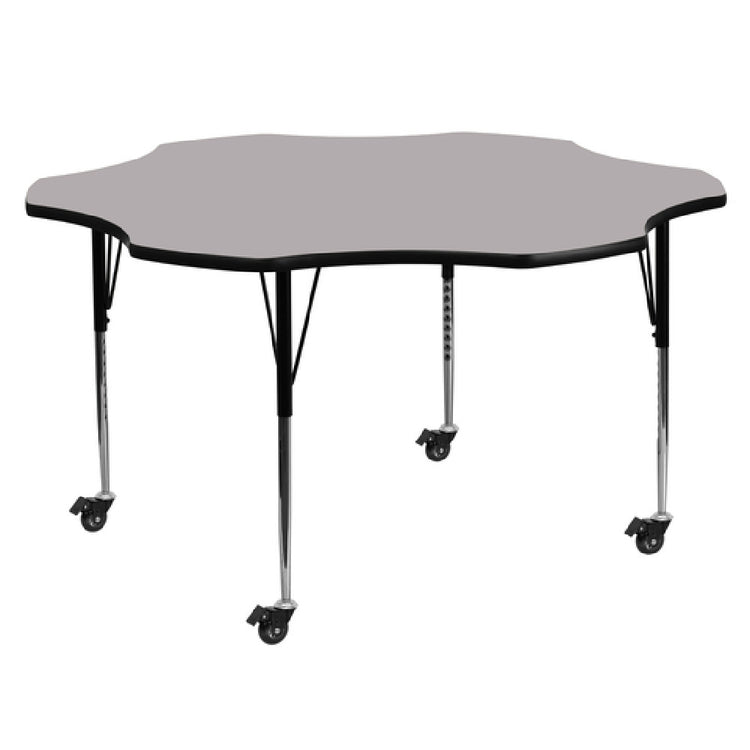 The Flash Furniture XU-A60-FLR-GY-T-A-CAS-GG Activity Table - designed for versatile functionality - is suited for various environments requiring adaptable workspace solutions. This table features a unique flower-shaped top, measuring 60 inches in both width and depth, providing ample space for a range of activities. The surface is crafted from a 1-1/8 inch thick thermal fused gray laminate, which is both scratch and stain resistant, ensuring durability and ease of maintenance. A black edge band adds a sleek finish, enhancing its overall aesthetic appeal. The table's 16 gauge tubular steel legs contribute to its sturdy construction, with black powder coated upper legs and chrome lower legs that are adjustable in height from 22-1/4 inches to 30-2/5 inches, catering to different user preferences and needs. Equipped with locking casters, the table offers convenient mobility and secure placement. Assembly is required, and the product is shipped in two boxes, with most in-stock items typically dispatched within 24 hours. This activity table is ideal for educational settings, collaborative workspaces, and dynamic office environments, providing a reliable and adaptable solution for various tasks and activities.