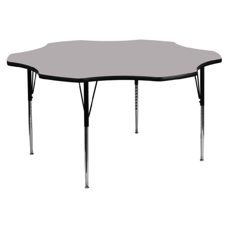 The Flash Furniture XU-A60-FLR-GY-T-A-GG Activity Table, measuring 60"W x 60"D and offering an adjustable height range from 21-1/8" to 30-1/8", is an innovative solution tailored for various educational and collaborative environments. Its distinctive flower-shaped design is not only aesthetically pleasing but also promotes group interaction and effective space utilization. The table features a 1-1/8" thick thermal fused gray laminate top, offering a scratch and stain resistant surface that ensures durability and longevity. Complementing the tabletop's resilience, the black edge band adds a sleek finish while providing additional protection against wear. Constructed with 16 gauge tubular steel legs, the table balances sturdiness with mobility. The black powder-coated upper legs and chrome lower legs enhance its modern look and structural integrity. Self-leveling nylon floor glides are included to maintain stability across different flooring surfaces. The table is shipped in 2 boxes, ensuring secure and efficient delivery, with in-stock items typically dispatched within 24 hours. This versatile activity table is especially suitable for schools, meeting rooms, and creative workspaces, serving as a reliable hub for interaction, learning, and collaboration across diverse settings.