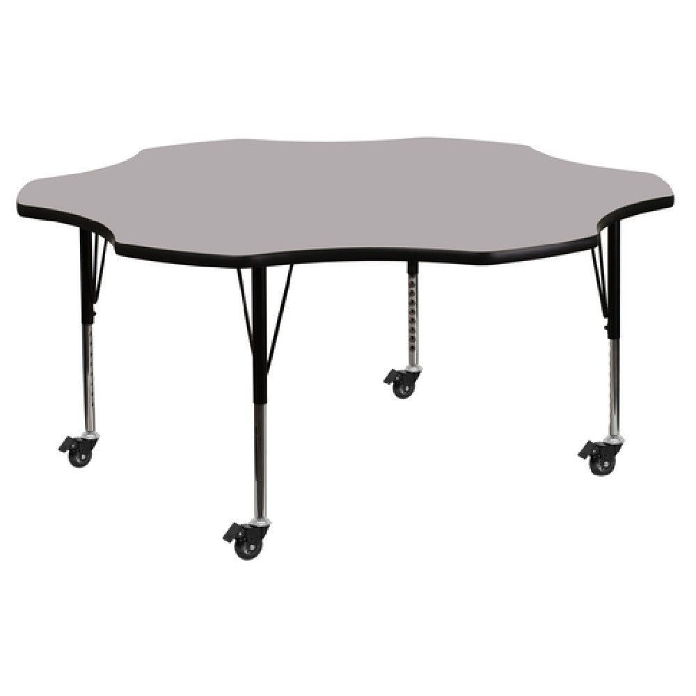 The Flash Furniture XU-A60-FLR-GY-T-P-CAS-GG Activity Table provides a versatile and durable solution for educational and collaborative environments. This flower-shaped table features a substantial 60 inches by 60 inches surface area, designed to cater to a range of activities. The table's height is adjustable from 17-2/5 inches to 25-2/5 inches, accommodating users of various ages and needs. Its 1-1/8 inch thick thermal fused gray laminate top is engineered to resist scratches and stains, ensuring long-lasting use and easy maintenance. Encircling the tabletop is a protective black edge band, offering both aesthetic appeal and additional durability. The table's structure is supported by 16 gauge tubular steel legs, with a combination of black powder coated upper legs and chrome lower legs, providing exceptional stability and style. Equipped with locking casters, this activity table can be effortlessly moved and secured in place as needed, enhancing its adaptability in dynamic settings. Shipped in two boxes and requiring assembly, the Flash Furniture XU-A60-FLR-GY-T-P-CAS-GG Activity Table is typically available for quick dispatch within 24 hours, making it a practical choice for institutions seeking efficient furnishing solutions that blend functionality with contemporary design.