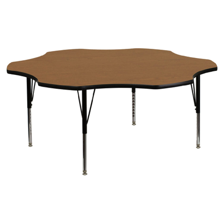 The Flash Furniture XU-A60-FLR-OAK-T-P-GG Activity Table is a versatile and durable table designed to meet the needs of various settings, from educational to professional environments. With dimensions of 60"W x 60"D, this flower-shaped table provides ample space for multiple users. The table's height is adjustable, ranging from 16-1/8" to 25-1/8", allowing for customization based on user preference or task requirements. The 1-1/8" thick thermal fused oak laminate top is both scratch and stain resistant, ensuring long-lasting durability and ease of maintenance. Encased by a black edge band, the table is supported by 16 gauge tubular steel legs, featuring black powder-coated upper legs and chrome lower legs for added stability and aesthetic appeal. Equipped with self-leveling nylon floor glides, this table ensures stability on uneven surfaces. Shipped in 2 boxes, in-stock items typically ship within 24 hours, ensuring quick delivery for urgent needs. The combination of robust materials and thoughtful design makes this activity table an ideal choice across different segment markets for its adaptability and resilience.