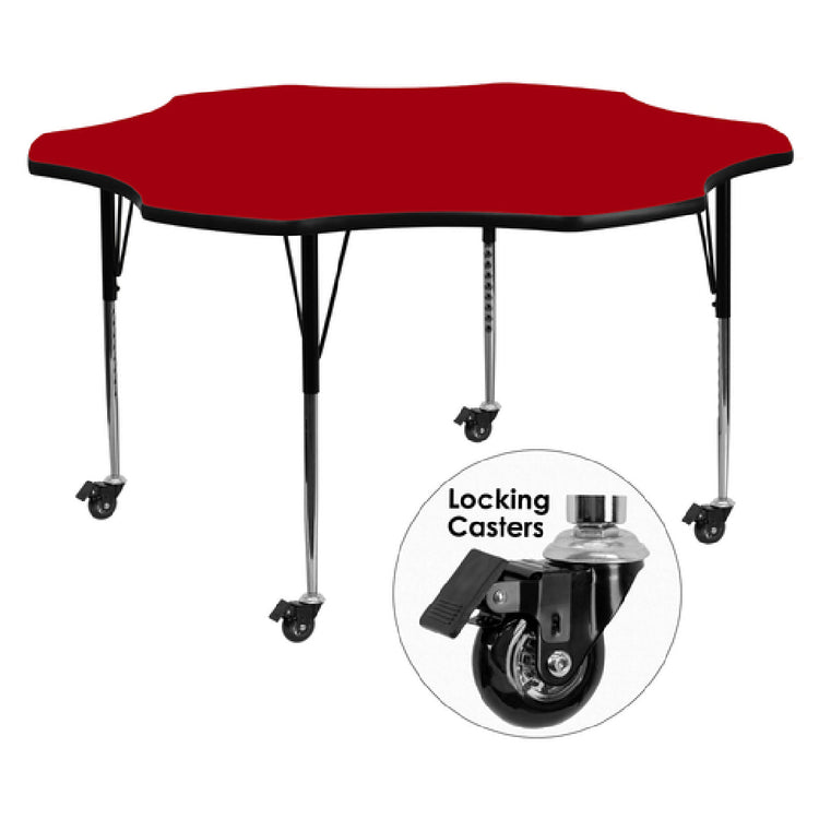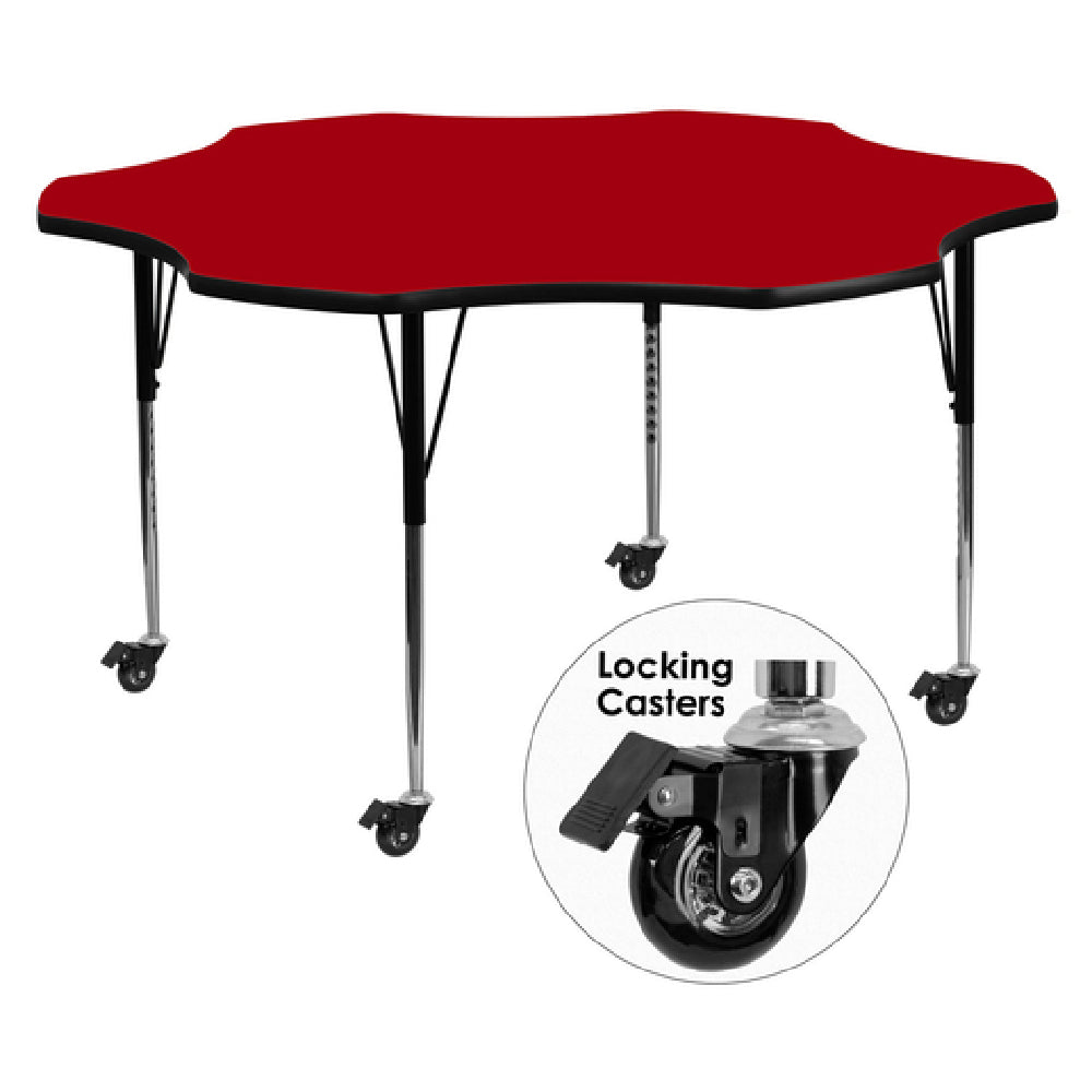 The Flash Furniture XU-A60-FLR-RED-T-A-CAS-GG Activity Table is expertly crafted to serve diverse educational and professional environments. Measuring 60 inches in width and depth, it features a distinctive flower-shaped design that enhances collaborative settings. The table's height is adjustable between 22-1/4 inches and 30-2/5 inches, offering versatility to accommodate various user needs and preferences. The 1-1/8 inch thick thermal fused red laminate top is both scratch and stain resistant, ensuring durability and longevity in high-traffic areas. A protective black edge band further guards against wear and tear, while the sturdy 16-gauge tubular steel legs provide reliable support. The table's black powder coated upper legs and chrome lower legs add a sleek aesthetic, and the inclusion of locking casters allows for effortless mobility and stability, making it adaptable to changing spatial requirements. This product requires assembly and is conveniently shipped in two boxes, with in-stock items typically dispatched within 24 hours. The Flash Furniture XU-A60-FLR-RED-T-A-CAS-GG Activity Table is an ideal choice for dynamic learning environments and versatile workspaces, delivering a blend of practical functionality and modern design.