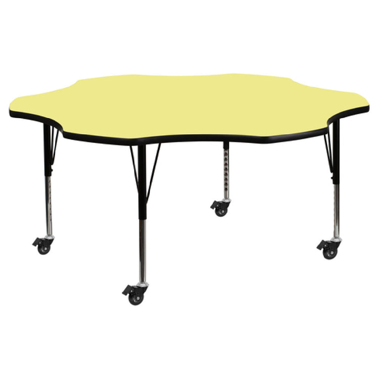 The Flash Furniture XU-A60-FLR-YEL-T-P-CAS-GG Activity Table is a versatile and dynamic piece tailored for various educational and professional settings. With dimensions of 60"W x 60"D, this table features a unique flower-shaped design, providing ample space for collaborative activities. The table's height is adjustable from 17-2/5" to 25-2/5", accommodating users of different ages and heights, thus enhancing comfort and accessibility. The 1-1/8" thick thermal fused yellow laminate top is both scratch and stain resistant, ensuring durability and longevity even in high-traffic environments. A black edge band reinforces the table's sturdiness, while its 16-gauge tubular steel legs offer robust support. The upper legs are finished with a black powder coating, and the lower legs are chrome-plated, adding a sleek aesthetic appeal. Equipped with locking casters, this table allows for easy mobility and secure positioning, making it ideal for flexible learning or working spaces. Assembly is required, and the product is shipped in two boxes, with stock items typically dispatched within 24 hours. The Flash Furniture XU-A60-FLR-YEL-T-P-CAS-GG Activity Table is an exceptional choice for those seeking adaptability, durability, and style in a single, functional package.