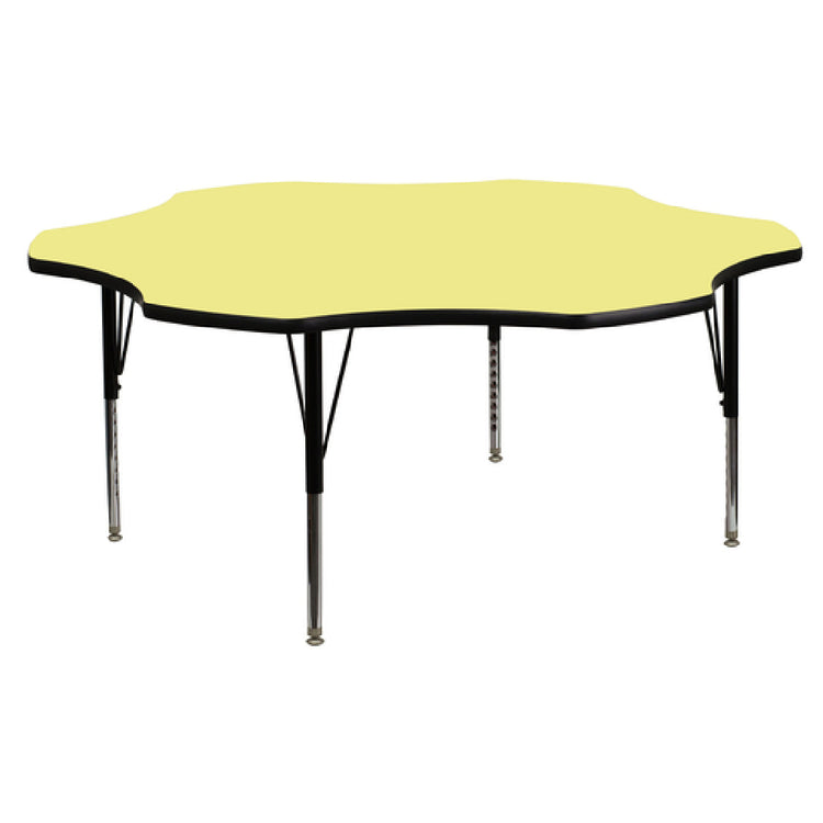 The Flash Furniture XU-A60-FLR-YEL-T-P-GG Activity Table is a versatile and functional piece designed to meet the needs of various industry sectors, including educational, corporate, and recreational environments. This flower-shaped table measures 60 inches in width and 60 inches in depth, providing ample space for group activities and collaborative work. The table's height is adjustable, ranging from 16-1/8 inches to 25-1/8 inches, allowing it to accommodate users of different ages and sizes. Constructed with a 1-1/8 inch thick thermal fused yellow laminate top, the table is both scratch and stain resistant, ensuring durability and longevity. The black edge band adds a touch of style while protecting the edges from wear and tear. Supported by 16-gauge tubular steel legs, the table features black powder-coated upper legs and chrome lower legs for a sleek, modern look. The inclusion of self-leveling nylon floor glides ensures stability on uneven surfaces, making it a practical choice for dynamic environments. Shipped in two boxes, this activity table is typically ready for dispatch within 24 hours, ensuring prompt delivery for timely setup. Its robust construction and thoughtful design make it an essential asset for any space that values adaptability and resilience.