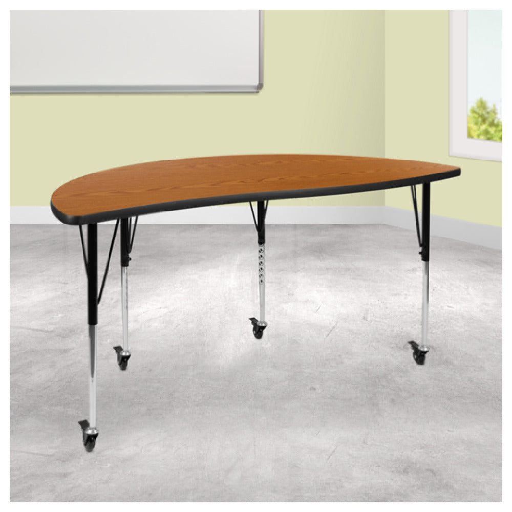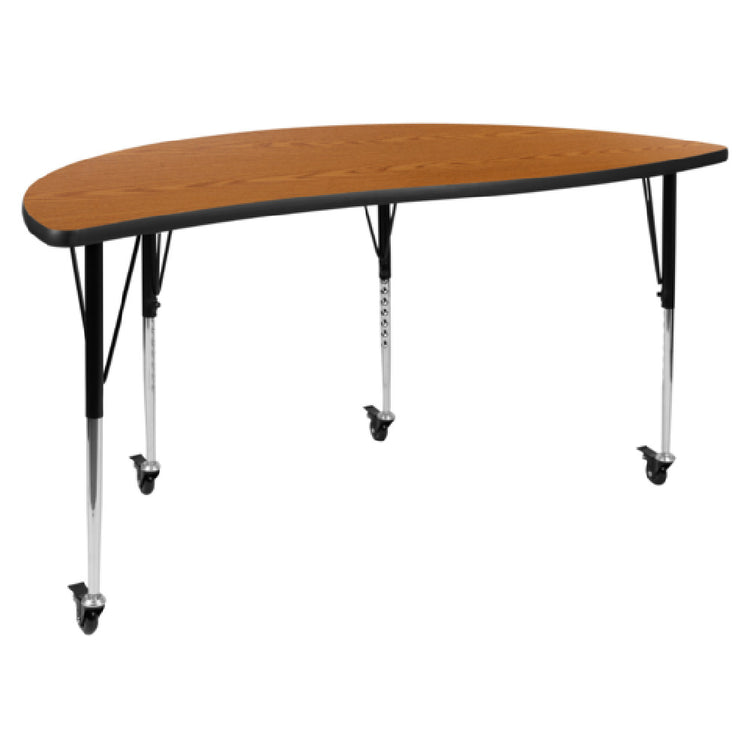 The Flash Furniture XU-A60-HCIRC-OAK-T-A-CAS-GG Activity Table is a versatile and robust solution for various environments, such as educational institutions, training facilities, and collaborative workspaces. Measuring 60 inches in width and 30 inches in depth, this activity table features an adjustable height range from 22 to 30 inches, catering to diverse user needs and preferences. Its half-circle wave design provides a unique aesthetic and functional configuration, allowing for easy integration into different layouts. The table's 1-inch thick thermal fused oak laminate top is both scratch and stain resistant, ensuring durability and longevity in high-traffic areas. The black edge band adds a sleek finish while providing additional protection. Constructed with 16-gauge tubular steel legs, this table boasts strength and stability, further enhanced by black powder-coated upper legs and chrome lower legs. The inclusion of locking casters offers mobility and convenience, making it easy to reposition or store as needed. Assembly is required for this product, which is shipped in two boxes, with in-stock items typically dispatched within 24 hours. This well-crafted activity table is an excellent choice for those seeking a reliable, adaptable, and aesthetically pleasing furniture solution in their professional or educational space.