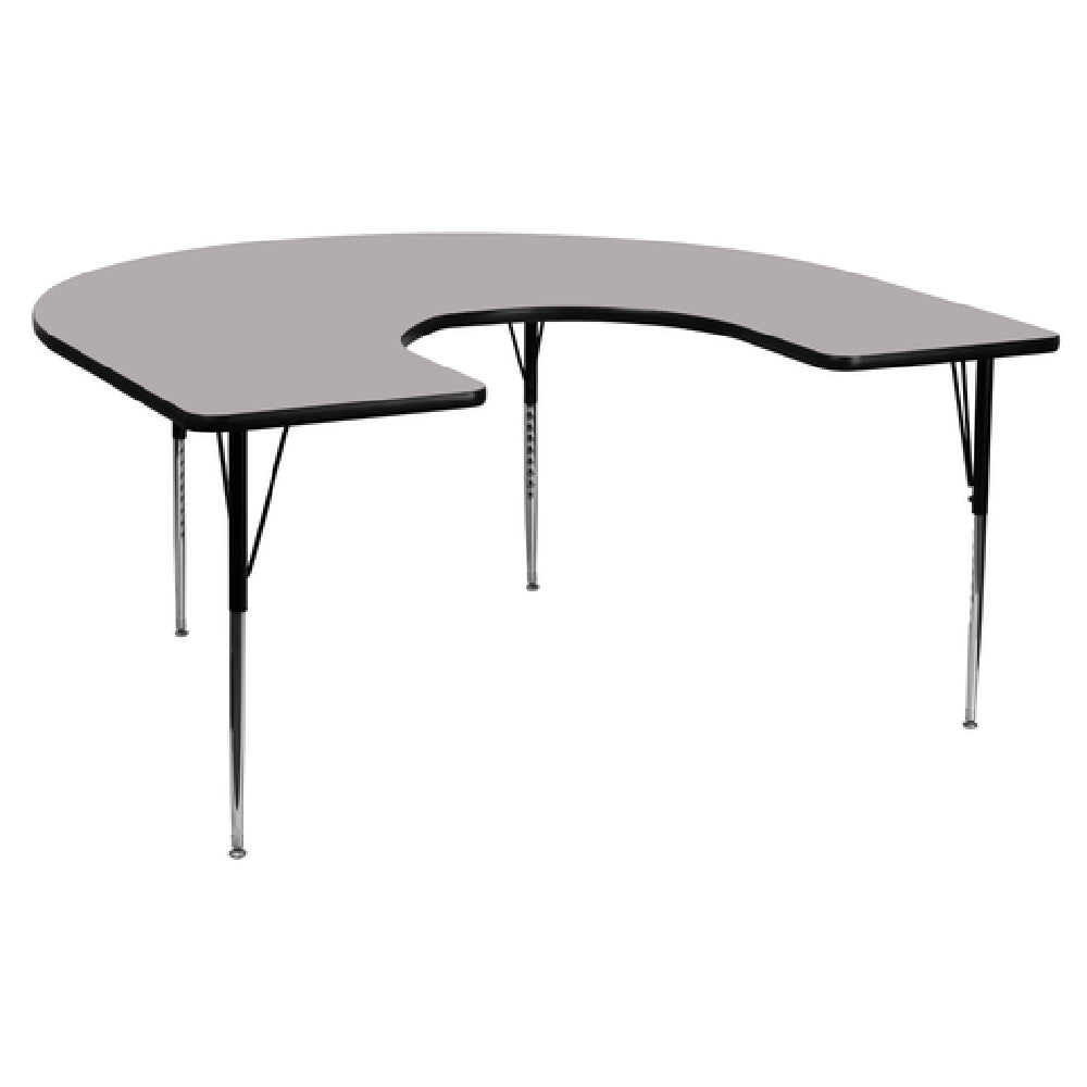 The Flash Furniture XU-A6066-HRSE-GY-T-A-GG Activity Table is a versatile piece designed to accommodate various settings such as educational institutions, collaborative workspaces, and training environments. Measuring 66"W x 60"D, this table features an adjustable height range of 21-1/2" to 30-1/8", making it adaptable for different age groups and seating preferences. The table's top is constructed from 1-1/8" thick thermal fused gray laminate, providing a durable, scratch and stain-resistant surface that stands up to the rigorous demands of daily use. The surrounding black edge band enhances both its aesthetic appeal and durability. Supported by 16-gauge tubular steel legs, this table ensures stability and longevity. The design incorporates black powder-coated upper legs and chrome lower legs, adding a modern touch to its functionality. Self-leveling nylon floor glides are included, ensuring a stable setup on uneven surfaces. This product is shipped in two boxes and typically dispatched within 24 hours when in stock, ensuring timely delivery for immediate needs. The Flash Furniture XU-A6066-HRSE-GY-T-A-GG Activity Table, with its robust construction and flexible design, is an excellent choice for those seeking a reliable solution for dynamic, multi-use environments.