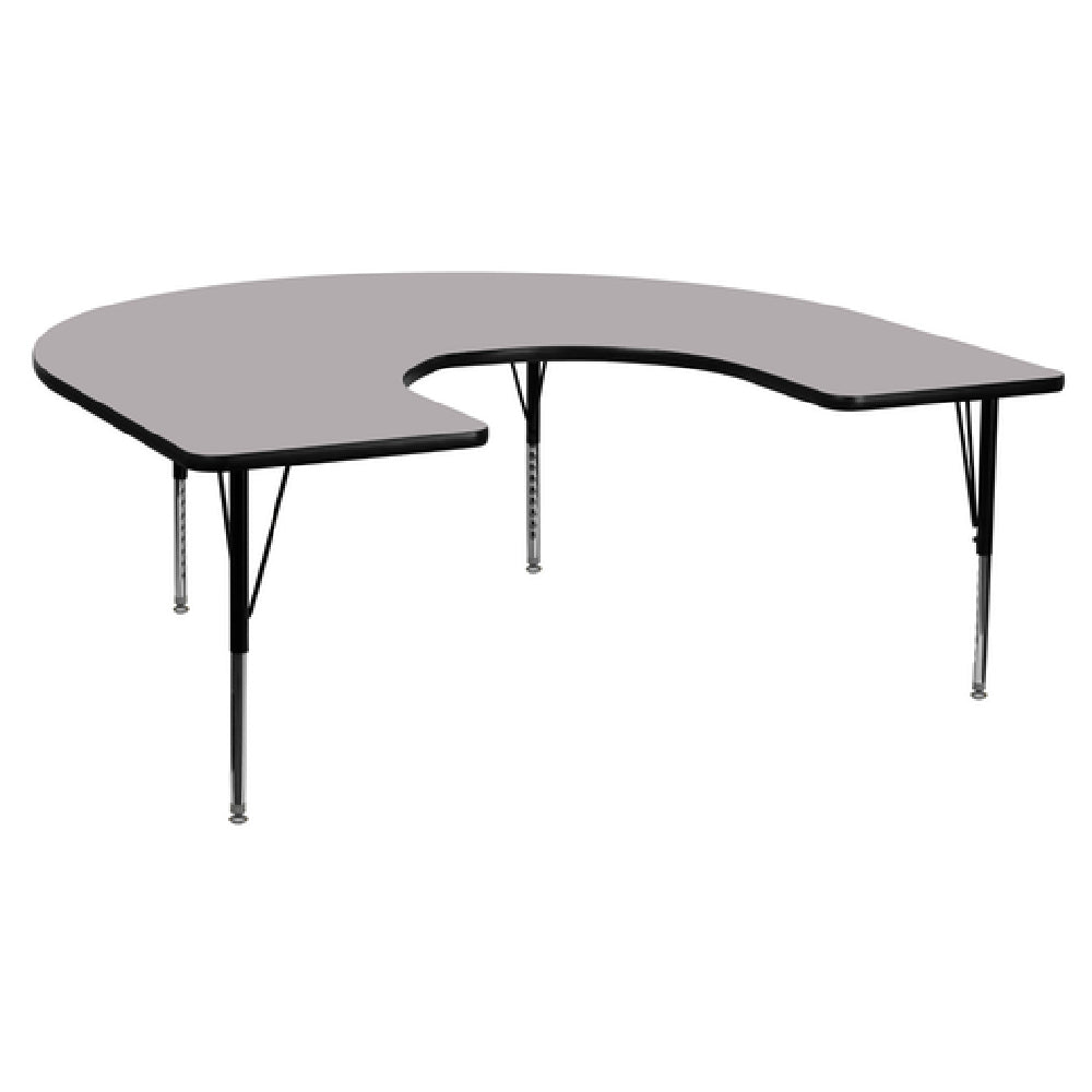The Flash Furniture XU-A6066-HRSE-GY-T-P-GG Activity Table is a versatile piece designed to cater to various settings, including educational and creative environments. Measuring 66 inches wide by 60 inches deep, this horseshoe-shaped table offers ample space for collaborative activities. Its height is adjustable from 16-1/8 inches to 25-1/8 inches, accommodating users of different ages and statures. The table's 1-1/8 inch thick thermal fused gray laminate top is engineered to resist scratches and stains, ensuring durability and longevity. The black edge banding provides additional protection against everyday wear. Constructed with 16 gauge tubular steel legs, the table boasts stability and strength, essential for high-traffic areas. The legs feature a black powder-coated finish on the upper section and chrome on the lower, adding a sleek aesthetic touch. Self-leveling nylon floor glides are included, allowing for easy adjustment on uneven surfaces, making it a practical choice for dynamic environments. Shipped in two boxes, this product is often dispatched within 24 hours of order, ensuring quick availability for immediate needs. The Flash Furniture XU-A6066-HRSE-GY-T-P-GG Activity Table is ideal for schools, offices, and communal spaces where flexibility and durability are paramount.