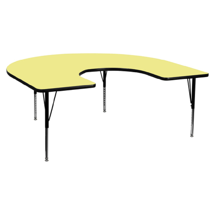 The Flash Furniture XU-A6066-HRSE-YEL-T-P-GG Activity Table is a versatile and functional piece designed for educational and professional environments. With dimensions of 66"W x 60"D, it features an adjustable height range from 16-1/8" to 25-1/8", providing flexibility for various activities and user needs. Its horseshoe shape makes it ideal for collaborative settings, promoting engagement and interaction. The table's 1-1/8" thick thermal fused yellow laminate top is both scratch and stain resistant, ensuring durability and easy maintenance. Encased with a black edge band, this table exudes a professional appearance while the robust 16 gauge tubular steel legs contribute to its sturdiness. The black powder-coated upper legs combined with chrome lower legs enhance its aesthetic appeal. Self-leveling nylon floor glides are included to maintain stability on uneven surfaces, ensuring a steady work or play area. Shipped in two boxes for convenience, in-stock items typically dispatch within 24 hours. Whether utilized in classrooms, training sessions, or activity centers, this table's durable construction and adaptable features cater to a variety of market segments, making it a valuable addition to any collaborative space.