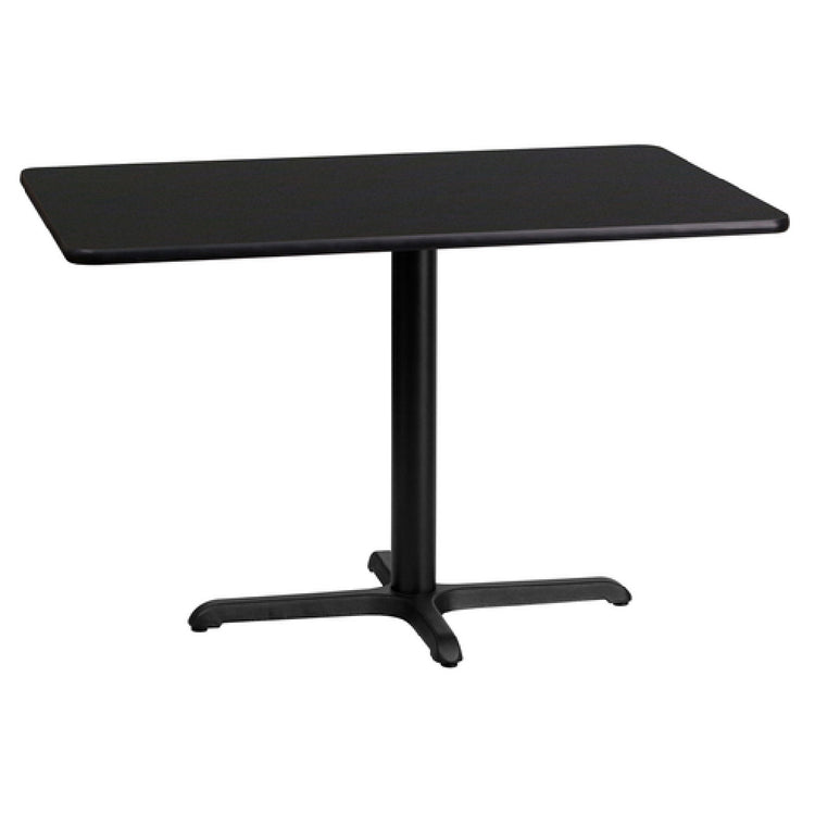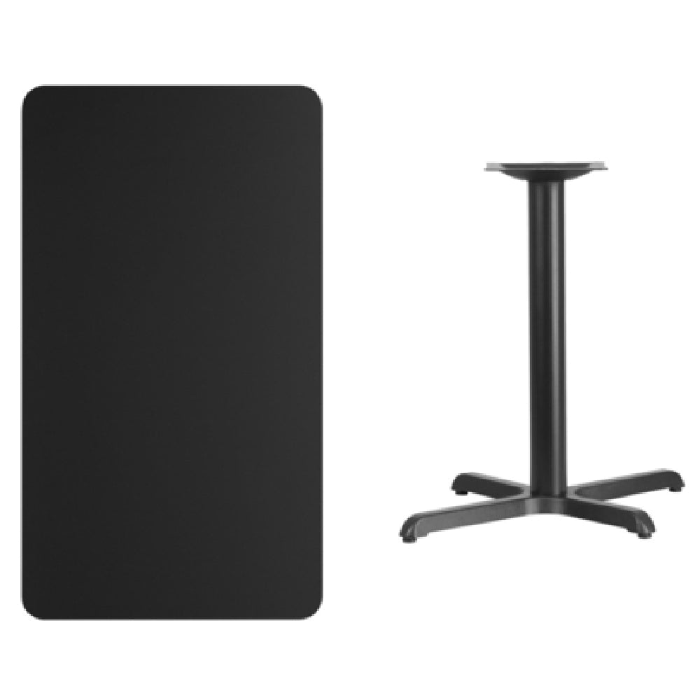 The Flash Furniture XU-BLKTB-2442-T2230-GG Table 42"W x 24"D x 31-1/8"H Dining Height is a meticulously designed piece tailored for commercial use, showcasing a sleek black laminate finish. This rectangular table features a robust 1-1/8" thick MDF with a melamine core, ensuring durability and longevity in high-traffic environments such as restaurants, cafes, and dining halls. The black PVC T-mold edge adds to its refined aesthetics while providing additional protection against wear and tear. It is supported by a sturdy 22" x 30" x-base and a 3" diameter cast iron column, which are powder-coated in black for a polished look and enhanced resilience against rust and scratches. The pre-welded top plate ensures stability and ease of assembly, as the product is shipped in three boxes and requires assembly upon delivery. The Flash Furniture table's dimensions make it an ideal fit for various dining setups, offering adequate surface area while maintaining a compact footprint. Typically, in-stock items ship within 24 hours, ensuring quick delivery for urgent furnishing needs. This table is a valuable asset for any commercial dining setting, combining style, strength, and functionality.