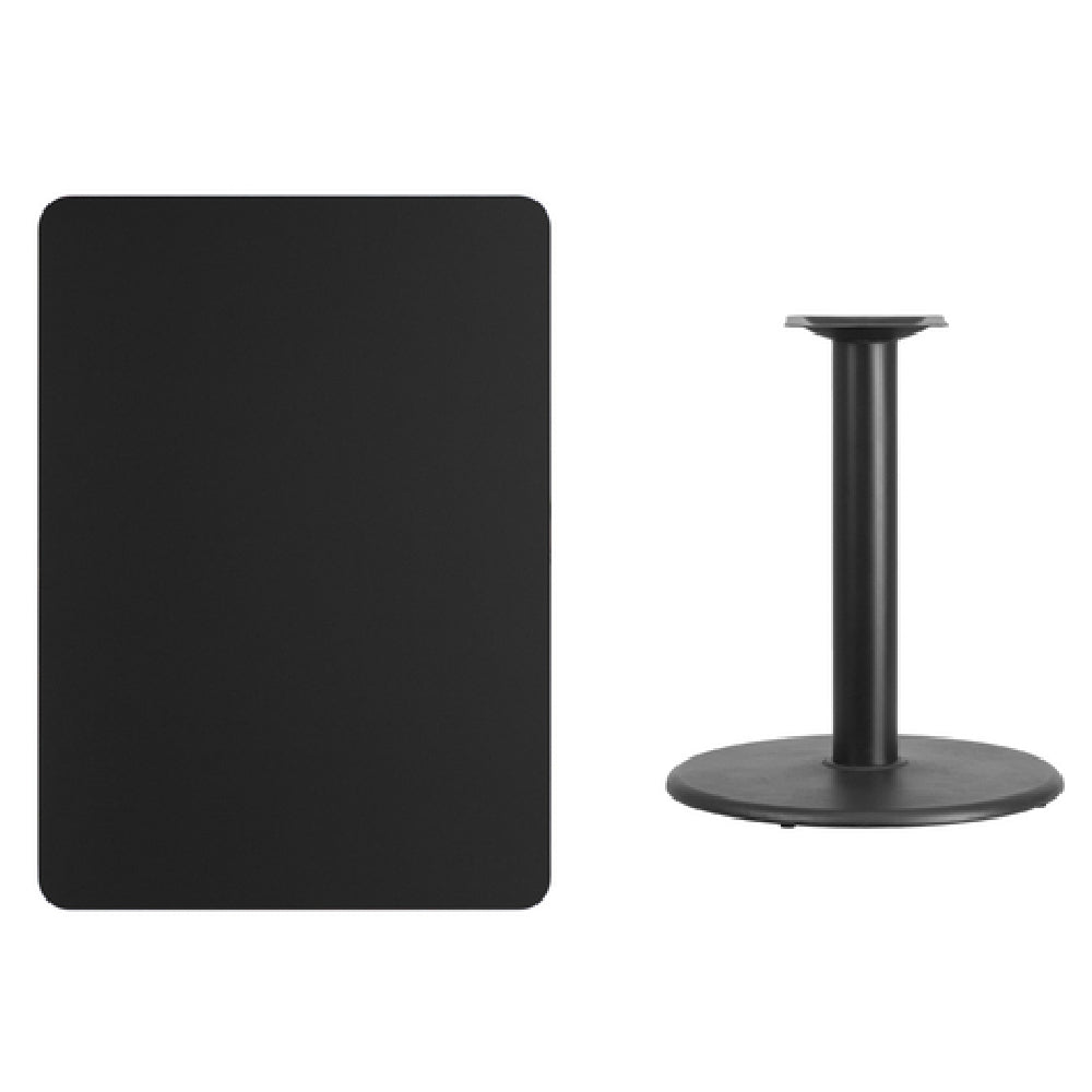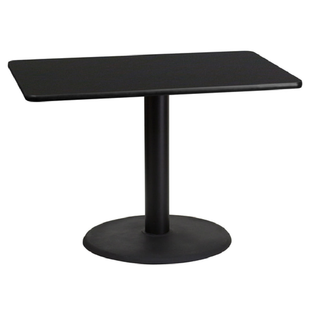 The Flash Furniture XU-BLKTB-3042-TR24-GG Table 42"W X 30"D X 31-1/8"H Dining Height is a versatile rectangular table meticulously engineered to meet the demands of commercial environments. With precise dimensions of 42 inches in width, 30 inches in depth, and a dining height of 31-1/8 inches, this table offers ample surface area while maintaining an ergonomic height for dining settings. Its 1-1/8 inch thick MDF construction is fortified with a melamine core, ensuring durability and stability. The sleek black laminate finish, complemented by a black PVC T-mold edge, adds a touch of sophistication, making it suitable for a variety of settings, from modern restaurants to collaborative office spaces. The table's robust support is assured by a pre-welded top plate and a substantial 24-inch diameter base, featuring a 4-inch diameter cast iron column with a durable black powder-coated finish. This design not only enhances the table's aesthetic appeal but also ensures its longevity in high-traffic areas. Assembly is required, and the product is conveniently shipped in three boxes. As an in-stock item, it is typically ready for shipment within 24 hours, making it an efficient choice for businesses seeking reliable and attractive furniture solutions.