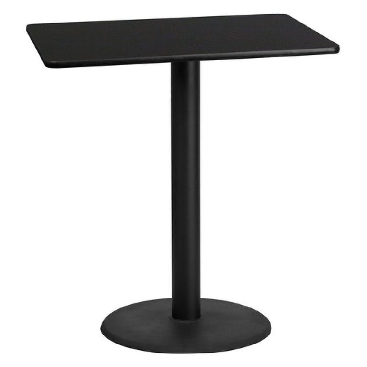 Flash Furniture XU-BLKTB-3042-TR24B-GG Table 42"W x 30"D x 43-1/8"H Bar Height is designed to meet the demands of various commercial environments with its practical dimensions and durable construction. This rectangular table features a 1-1/8" thick MDF with melamine core, providing a sturdy surface suitable for heavy-duty use. Its black laminate finish adds a sleek, modern touch, while the black PVC T-mold edge ensures added protection against wear and tear. The table's pre-welded top plate and robust 24" diameter base, supported by a 4" diameter cast iron column with a black powder-coated finish, assure stability and longevity. Shipped in three boxes, this table requires assembly upon delivery, yet its design and construction simplify the process. Typically available for shipping within 24 hours, this product is tailored for businesses prioritizing quick setup and functionality. The XU-BLKTB-3042-TR24B-GG is an ideal choice for restaurants, bars, and other commercial settings seeking an efficient and stylish table solution.