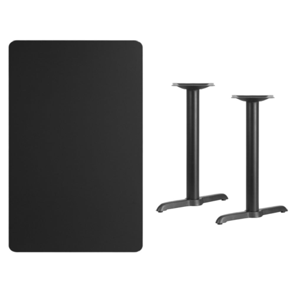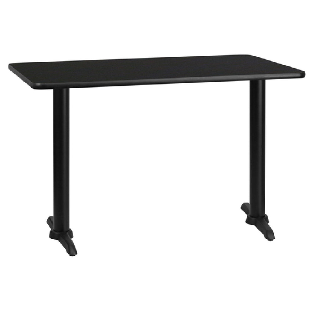 The Flash Furniture XU-BLKTB-3048-T0522-GG Table is a versatile and robust solution designed for commercial use, featuring a size of 48"W x 30"D x 31-1/8"H. This dining height table is rectangular with a 1-1/8" thick MDF core, coated with a melamine finish to ensure durability and longevity. Its black laminate finish coupled with a black PVC T-mold edge provides a sleek, modern appearance that easily complements various commercial settings. The table's design includes a pre-welded top plate and is supported by two 5" x 22" T-bases, enhancing stability and strength. The 3" diameter cast iron column is finished with a black powder coating, adding to the table's aesthetic appeal while ensuring resistance to wear and tear. This table is shipped in five boxes, with in-stock items typically dispatched within a 24-hour timeframe. The assembly is required upon delivery, a straightforward process designed to accommodate the fast-paced environments of restaurants, cafes, or any commercial dining area requiring reliable and attractive furniture solutions. The thoughtful design and durable materials make the Flash Furniture XU-BLKTB-3048-T0522-GG Table a valuable component in any professional dining setting.