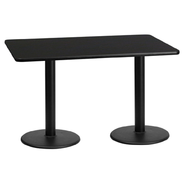 The Flash Furniture XU-BLKTB-3060-TR18-GG Table is a robust and versatile piece designed for commercial use, measuring 60 inches in width, 30 inches in depth, and 31-1/8 inches in height, making it ideal for dining settings. This rectangular table boasts a 1-1/8-inch thick MDF with a melamine core, providing durability and a sleek black laminate finish for a modern aesthetic. The black PVC T-mold edge enhances the table's resilience, ensuring it withstands daily wear and tear. Its construction includes a pre-welded top plate for added stability, supported by two 18-inch diameter bases and two 3-inch diameter cast iron columns, all finished with black powder coating for a cohesive look. This product is shipped in three boxes and requires assembly, making it a practical choice for businesses seeking a customizable and sturdy dining solution. Typically, in-stock items ship within 24 hours, ensuring quick availability. The Flash Furniture XU-BLKTB-3060-TR18-GG Table serves a broad market segment, from bustling restaurants to corporate dining areas, providing an excellent balance of functionality and style. Its design ensures longevity and ease of maintenance, catering to the demands of high-traffic environments with efficiency.