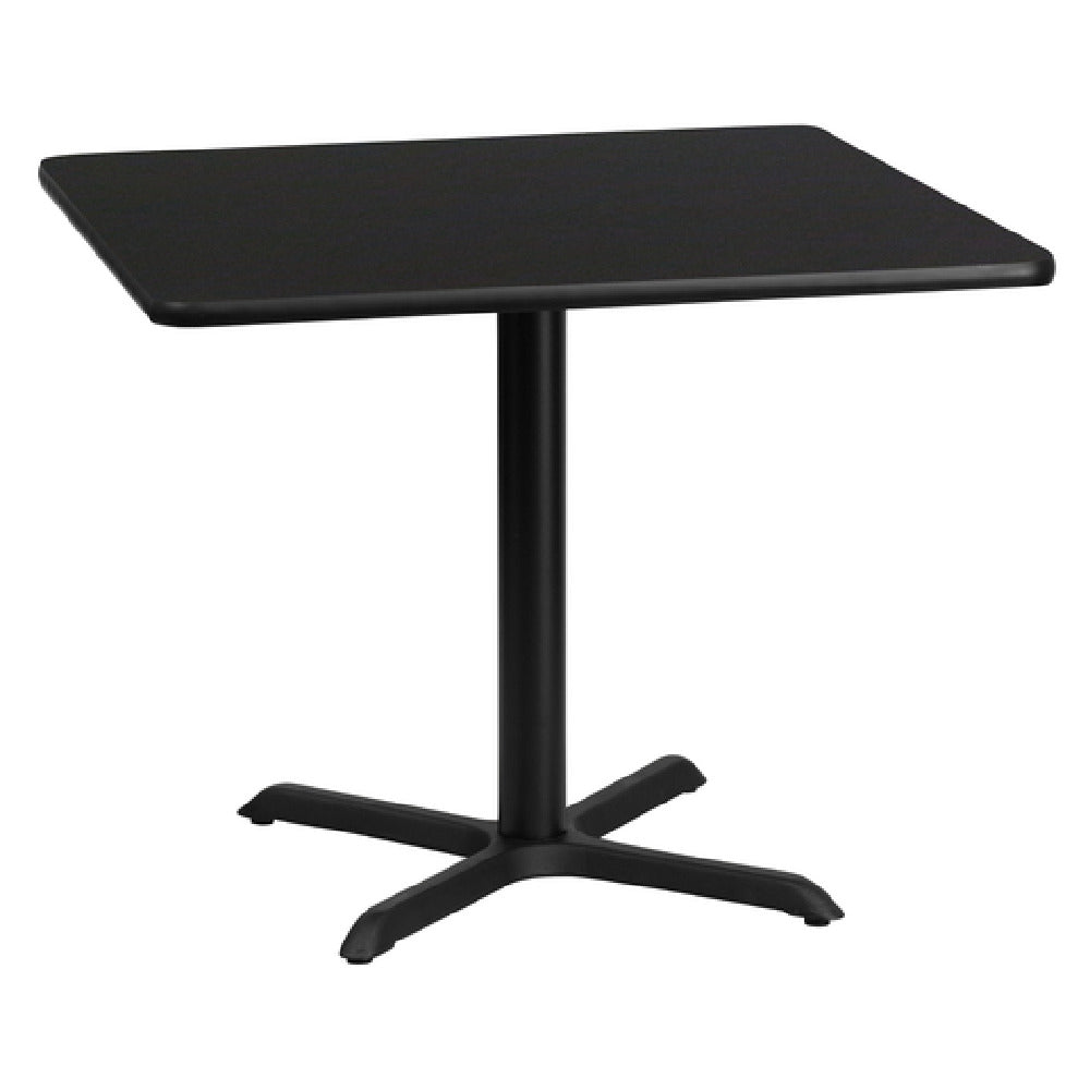 Flash Furniture XU-BLKTB-3636-T3030-GG Table 36"W X 36"D X 31-1/8"H Dining Height is a meticulously designed piece for commercial environments, offering a blend of functionality and style. This square table has dimensions of 36 inches in width and depth, with a height of 31-1/8 inches, perfectly suited for dining settings. The tabletop is crafted from medium-density fiberboard (MDF) with a melamine core, ensuring durability and a smooth surface. Its black laminate finish provides a sleek, modern appearance, complemented by a black PVC T-mold edge for enhanced durability. The table is supported by a robust 30-inch by 30-inch x-base, featuring a 3-inch diameter cast iron column with a black powder-coated finish, ensuring stability and longevity in high-traffic commercial use. Noteworthy is its pre-welded top plate, which adds to its structural integrity. This product requires assembly and is shipped in three boxes, with in-stock items typically dispatched within 24 hours. Ideal for cafes, restaurants, and dining spaces, the Flash Furniture table stands out for its sturdy construction and contemporary design, making it a versatile addition to various commercial dining environments.