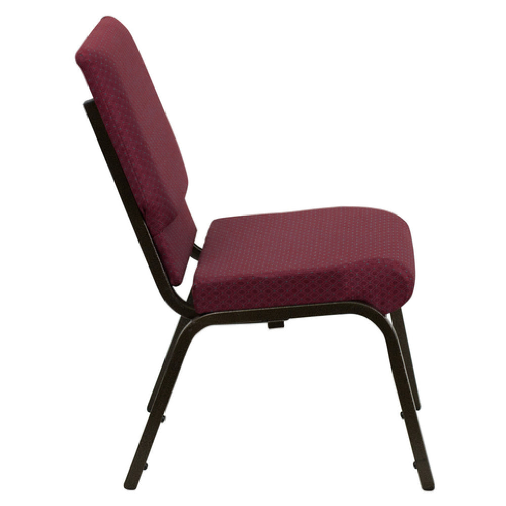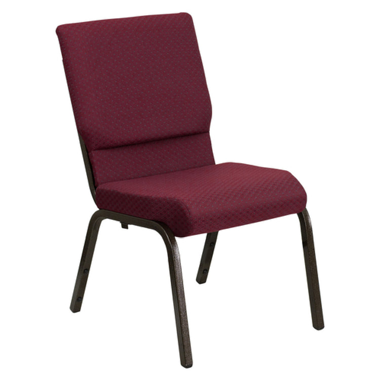 The Flash Furniture XU-CH-60096-BYXY56-GG Hercules Series Stacking Church Chair boasts an impressive 800 lb. weight capacity, making it a reliable seating solution for diverse environments. This chair is upholstered with a patterned polyester fabric, offering both style and durability. The seating comfort is enhanced by a 4-1/4" thick waterfall edge seat, crafted with CA117 fire retardant foam for added safety. A practical book pouch on the back provides convenient storage for personal items, which is particularly beneficial in church or conference settings. Constructed with a robust 16 gauge steel frame, this chair features a gold vein frame finish, adding an elegant touch to its sturdy design. The inclusion of ganging brackets allows for seamless row alignment in larger assemblies. Additionally, plastic rocker glides ensure smooth movement and floor protection. The chair is presented in a rich burgundy color, complementing various decors. It does require assembly but in-stock items typically ship within 24 hours, facilitating prompt delivery. This chair serves a versatile range of market segments, including religious institutions, conference halls, and event venues, where superior capacity and durability are paramount.