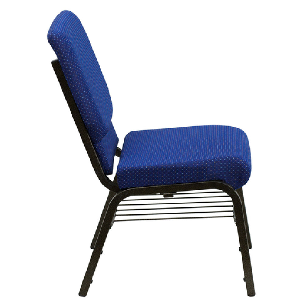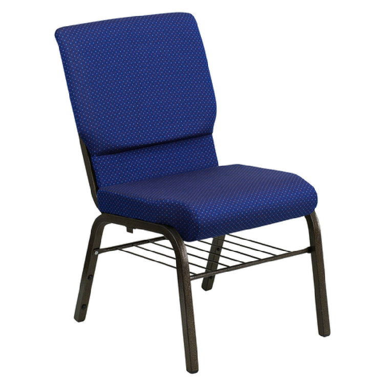 The Flash Furniture XU-CH-60096-NVY-DOT-BAS-GG Hercules Series Stacking Church Chair is a versatile seating solution with an impressive 800 lb. weight capacity, making it ideal for a variety of environments including religious institutions, conference centers, and community events. This chair features a dot-patterned polyester upholstery in a sophisticated navy blue, complemented by a sturdy 16-gauge steel frame with a gold vein finish. Comfort is ensured with a 4-1/4" thick waterfall edge seat designed to reduce pressure on the thighs. Safety is a priority with CA117 fire retardant foam, providing peace of mind in public settings. For added convenience, the chair incorporates a book pouch on the back and a steel book rack underneath, catering to settings where literature and materials are frequently used. Ganging brackets allow for secure chair linking, optimizing space utilization. Equipped with plastic rocker glides, this chair protects flooring while ensuring smooth mobility. Assembly is required, and in-stock items typically ship within 24 hours, demonstrating the manufacturer's commitment to efficient service. The Hercules Series Stacking Church Chair not only presents a balance of durability and comfort but also addresses the storage and safety needs of diverse venues with its innovative design.
