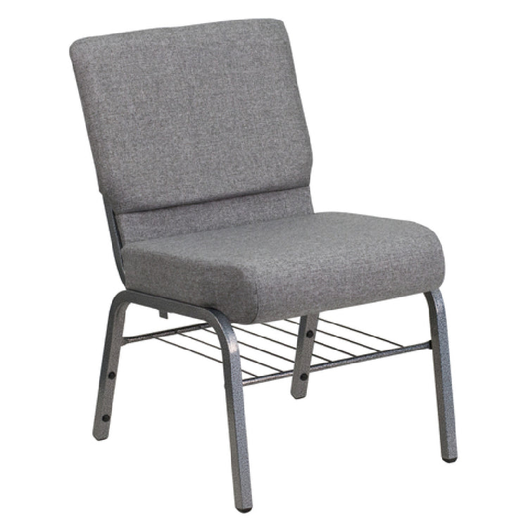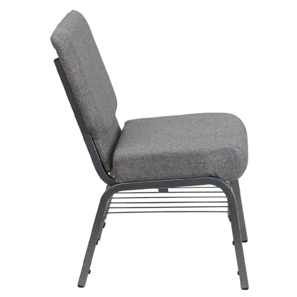 The Flash Furniture XU-CH0221-GY-SV-BAS-GG Hercules Series Extra Wide Stacking Church Chair is expertly designed to support a maximum weight capacity of 800 lb., making it a strong and reliable seating solution for various congregational settings. Upholstered with durable polyester, the chair features a 5" thick waterfall edge seat that promotes comfort and reduces leg strain during extended use. Safety is a priority, as showcased by its CA117 fire retardant foam. Unique to this model is the added convenience of a book pouch on the back, complemented by an 18"W x 16-1/2"D steel book rack, enhancing functionality in church and community gatherings. Constructed with a robust 16-gauge steel frame, the chair is finished with a silver vein coating, ensuring both longevity and aesthetic appeal. Ganging brackets are included, allowing for secure alignment in rows, while plastic rocker glides safeguard flooring surfaces. This chair is available in a classic gray color and requires assembly upon delivery. Ideal for settings that require frequent reconfiguration, its stackable design maximizes storage efficiency. Typically, this item ships within 24 hours when in stock, making it a practical choice for spaces where both style and substance are paramount.