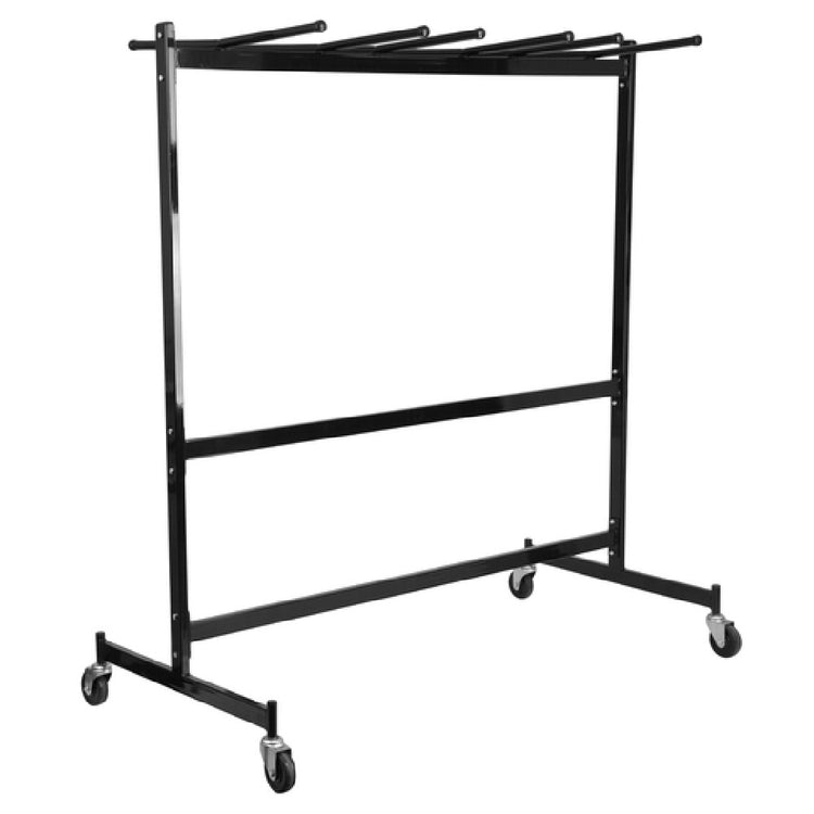 The Flash Furniture XU-CT-DOLLY-GG Chair And Table Combo Dolly is an essential tool for efficiently managing space and mobility in commercial settings. Measuring 66"W x 37-1/2"D x 71-1/2"H, this dolly is engineered to support up to 42 folding chairs and 8 tables ranging from 72" to 96"W and 18" to 36"D. Its design accommodates chair storage on both sides, utilizing 15-3/4"L x 11-1/4"W hanger bars equipped with rubber stoppers to securely hold items during transport. Constructed with a durable steel tubular frame, it features a glossy powder-coated finish that enhances its resilience and aesthetic appeal. This model is equipped with four 3-3/4" rubber swivel casters, facilitating smooth movement across various surfaces, which is particularly beneficial in dynamic environments such as conference centers, banquet halls, and educational institutions. The dolly's capacity to store and transport multiple chairs and tables simultaneously makes it an invaluable asset for businesses seeking to optimize efficiency and space utilization. Designed specifically for commercial use, the product requires assembly, but its robust build ensures long-term reliability. With in-stock items typically shipping within 24 hours, the Flash Furniture XU-CT-DOLLY-GG offers a practical and dependable solution for managing large seating and table arrangements.