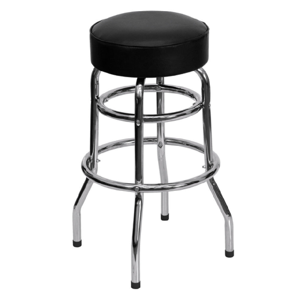 The Flash Furniture XU-D-100-GG Bar Stool Backless Black Vinyl Upholstered Padded Swivel Seat is a versatile seating solution designed for both style and functionality. This bar stool features a backless design with a black vinyl upholstered seat, providing a sleek and modern appearance suitable for various commercial settings. The padded swivel seat enhances comfort and flexibility, making it ideal for environments where mobility and interaction are key. The seat is constructed with CA117 fire retardant foam, ensuring safety and compliance with fire safety standards. A standout feature of this stool is its durable 18 gauge steel double ring chrome frame, which offers robust support and longevity. The inclusion of a foot ring adds to the user's comfort, while plastic floor glides protect flooring surfaces. This bar stool is specifically designed for commercial use, catering to businesses such as bars, restaurants, and cafes that require reliable and stylish seating. With the added benefit of quick shipping, as in-stock items typically ship within 24 hours, the Flash Furniture XU-D-100-GG Bar Stool is a practical choice for those seeking quality and efficiency in their seating options.