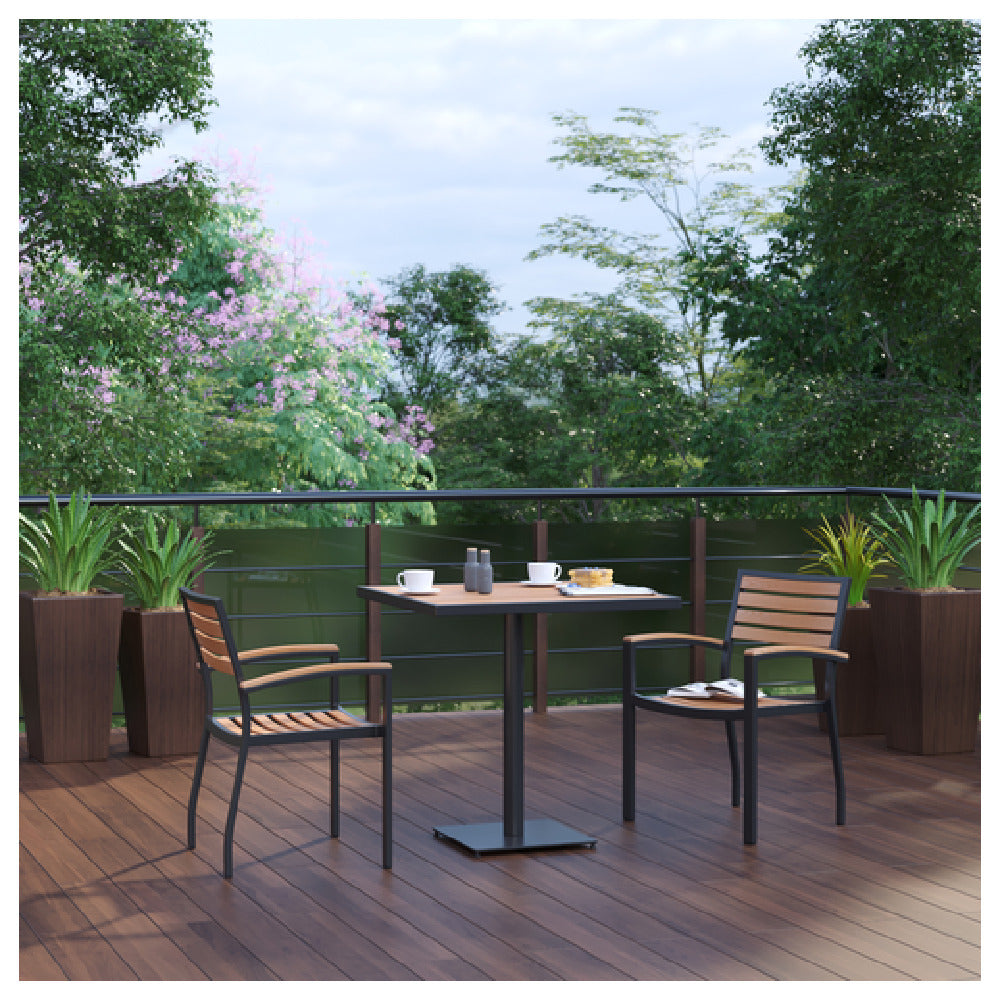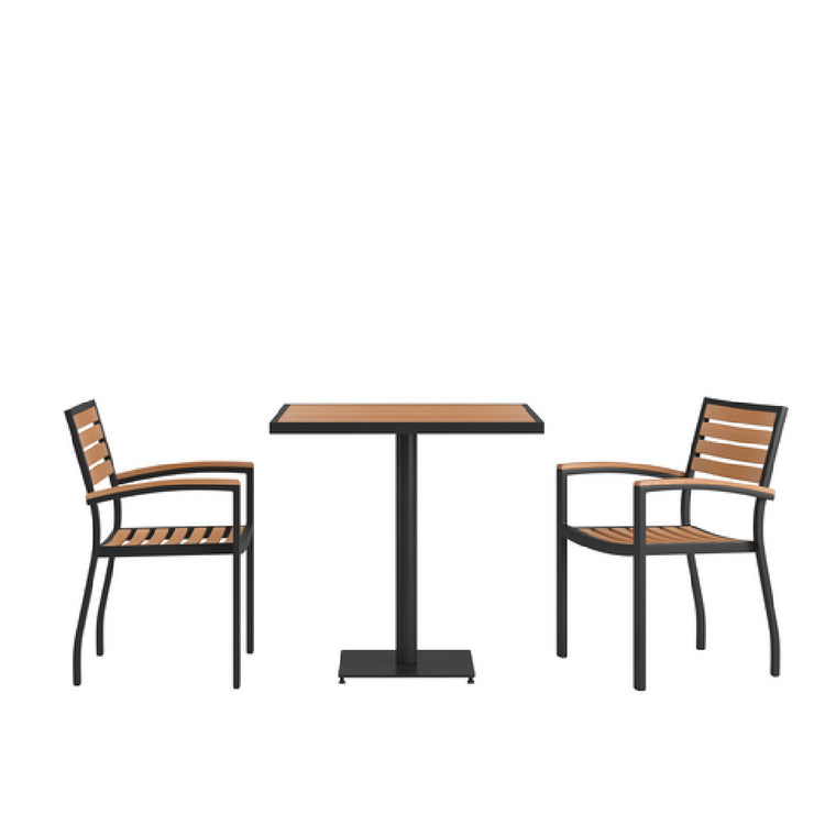 The Flash Furniture XU-DG-104560062-GG Patio Dining Table Set is a thoughtfully designed ensemble that combines durability and style, making it a versatile choice for various outdoor dining settings. This set includes a 30"W square table featuring a poly slatted top, which mimics the look of teak, offering an appealing aesthetic while ensuring resilience against outdoor elements. The table is supported by a sturdy steel frame and a square pedestal base, providing stability and support for outdoor use. Accompanying the table are two stacking chairs designed with teak accented arms, enhancing both comfort and visual appeal. The stacking feature allows for easy storage and space efficiency, catering to both residential and commercial settings. This patio dining set is an excellent choice for homeowners looking to enhance their outdoor spaces with a stylish and functional dining area, as well as for businesses in the hospitality industry seeking durable and attractive outdoor dining solutions. The combination of faux teak and steel in its construction ensures longevity and minimal maintenance, making it a practical investment for any outdoor environment. This dining set's blend of functionality, durability, and aesthetic appeal highlights its unique value proposition within the patio furniture market.
