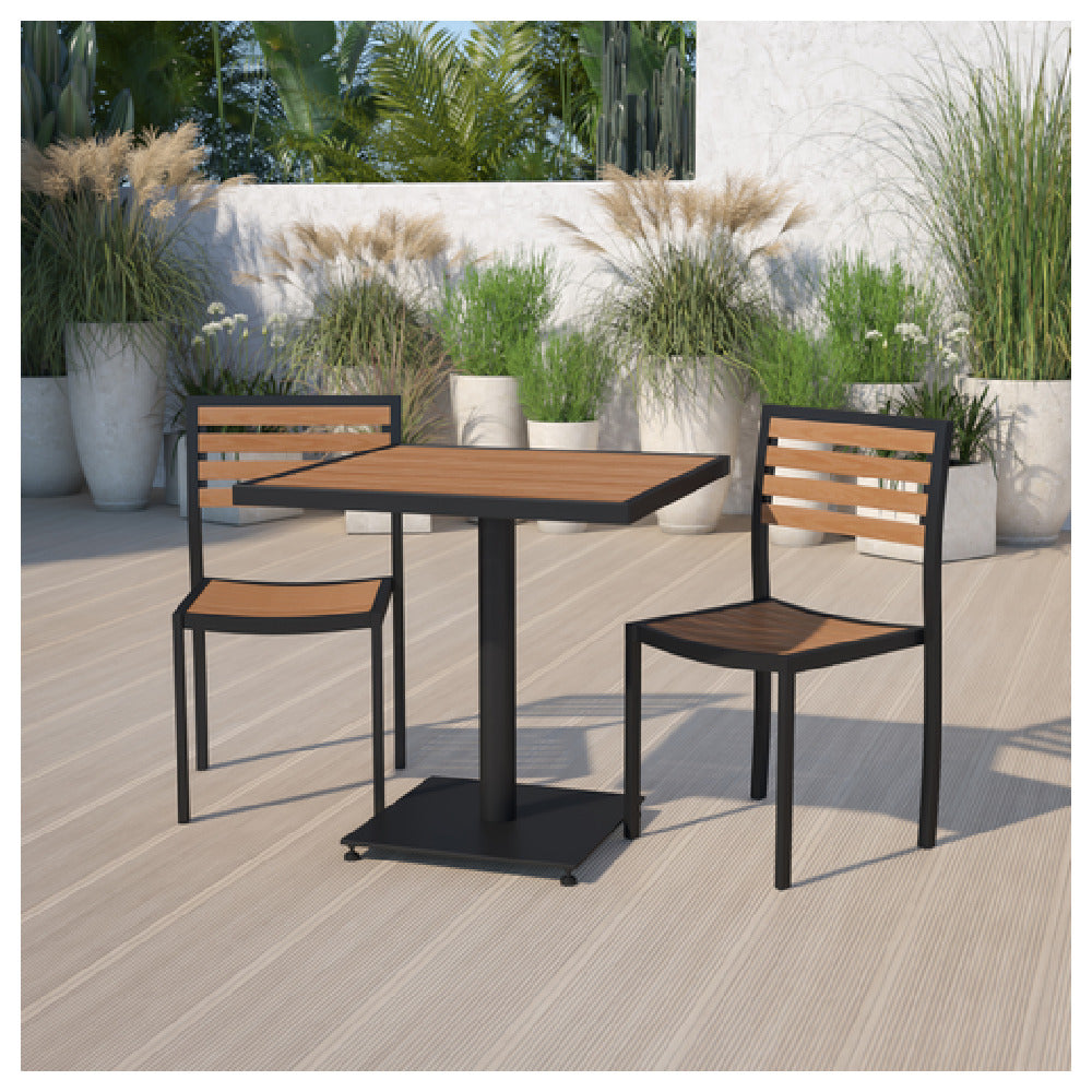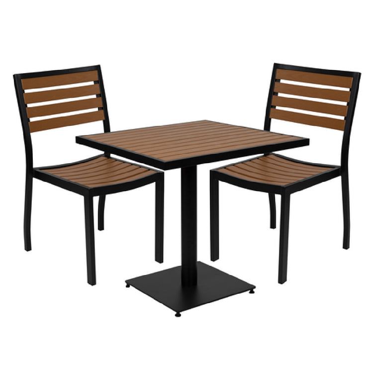Flash Furniture XU-DG-10456033-GG Table And Chair Set includes a meticulously designed ensemble catering to diverse outdoor furnishing needs. This set features a sturdy 30"W x 30"D x 30"H table with a steel pedestal base and frame, offering a substantial weight capacity of 150 lbs. The table's dimensions and robust design make it a versatile choice for various outdoor environments. Complementing this is a pair of chairs, each measuring 18-9/16"W x 18-1/2"D x 33-1/4"H, capable of supporting up to 300 lbs. The chairs boast a horizontal slat pattern on both the back and seat, enhancing their aesthetic appeal while providing ergonomic support. Constructed with a powder-coated aluminum frame, these chairs incorporate faux teak elements, ensuring durability and weather resistance, essential for outdoor use. The inclusion of plastic floor glides underscores the attention to preserving flooring surfaces from scratches and wear. Designed to facilitate quick and efficient shipping, in-stock items are typically dispatched within 24 hours, meeting the demands of both residential and commercial market segments. This table and chair set stands out for its blend of functionality, style, and resilience, making it a compelling choice for those seeking reliable outdoor furniture solutions.