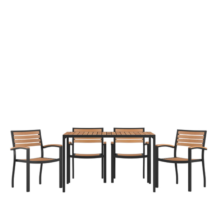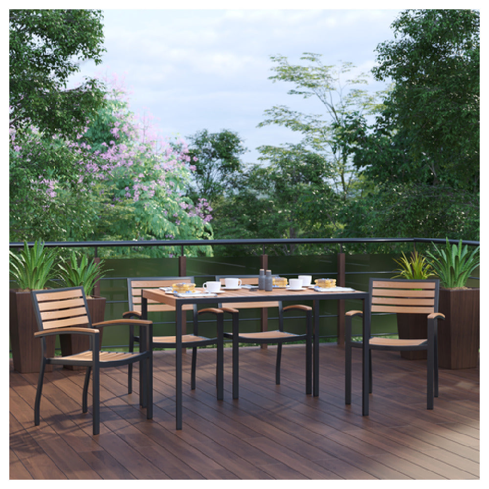The Flash Furniture XU-DG-304860064-GG Patio Dining Table Set is a meticulously designed outdoor furniture ensemble, featuring a 48-inch wide by 30-inch deep rectangular table with a synthetic teak slotted top. This design is not only aesthetically pleasing but also functional, as it includes an umbrella hole, making it a perfect choice for outdoor dining. The table is supported by a sturdy steel frame, ensuring durability and stability across various environmental conditions. Accompanying the table are four stacking chairs, each designed for convenience and space-saving storage. These chairs are accentuated with teak arms, providing an elegant touch that complements the synthetic teak table surface. This patio dining set is ideal for residential patios, commercial outdoor dining spaces, and hospitality venues, offering a versatile and stylish solution for diverse market segments. The combination of materials used in this set not only enhances its visual appeal but also promises longevity, making it a practical investment for establishments seeking to enhance their outdoor dining experience. With its blend of design, functionality, and durability, this dining set addresses the needs of users seeking both aesthetic value and practical utility for their outdoor spaces.
