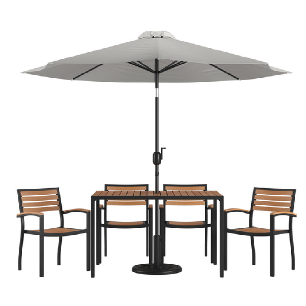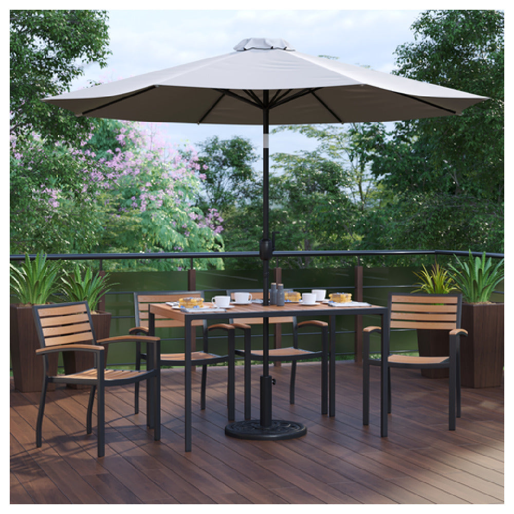 The Flash Furniture XU-DG-304860064-UB19BGY-GG Patio Dining Table Set is a meticulously crafted outdoor dining solution that seamlessly blends functionality with style. This set includes a 48-inch wide by 30-inch deep rectangular table, offering ample space for gatherings. The table is topped with a synthetic teak slotted surface, providing both aesthetic appeal and durability, while the integrated umbrella hole allows for convenient sun protection adjustments. Supporting the tabletop is a sturdy steel frame, ensuring stability and longevity in various outdoor conditions. Alongside the table, the set features a gray umbrella and a compatible umbrella base, enhancing its practicality for outdoor use. Completing this patio ensemble are four stacking chairs, each accented with teak arms, which not only add a touch of elegance but also facilitate easy storage and mobility. This patio dining set is an ideal choice for both residential and commercial applications, providing a versatile and stylish seating arrangement that caters to different market segments within the outdoor furniture industry. Its combination of quality materials and thoughtful design makes it a valuable asset for creating inviting outdoor dining experiences.