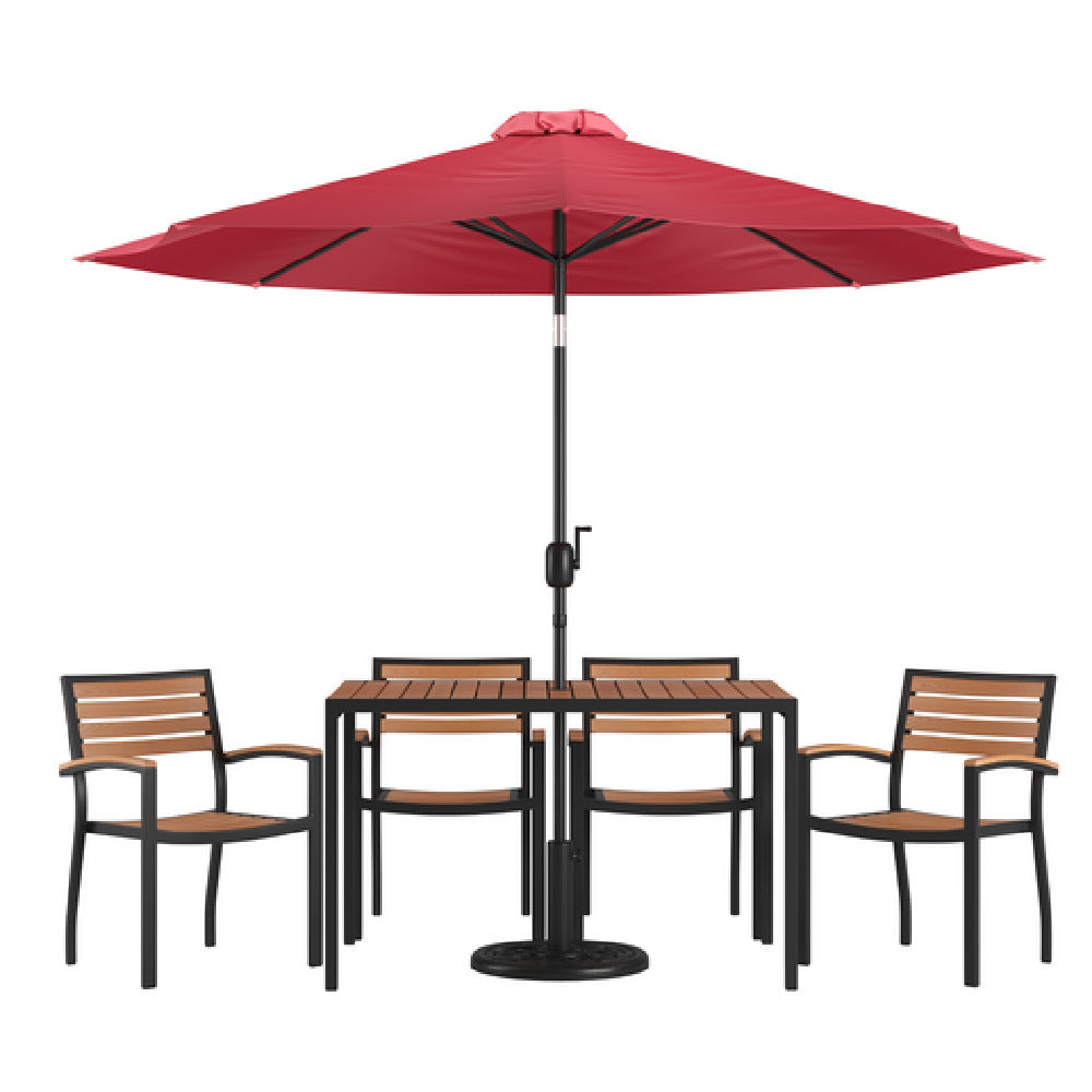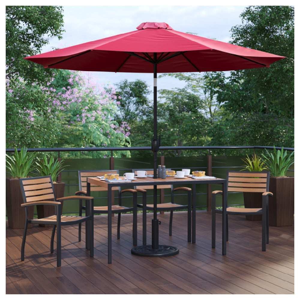 The Flash Furniture XU-DG-304860064-UB19BRD-GG Patio Dining Table Set is a meticulously crafted ensemble suitable for a variety of outdoor settings. This set includes a 48-inch wide by 30-inch deep rectangular table featuring a synthetic teak slotted top designed for durability and style. An umbrella hole is integrated into the table, providing functionality for sunny days. The table is supported by a robust steel frame, ensuring stability and longevity. Accompanying the table is a vibrant red umbrella, complete with a sturdy umbrella base, offering shade and comfort. The set includes four stacking chairs, each with teak accented arms, adding a touch of elegance and practicality by allowing easy storage. This patio dining set is ideal for residential backyards, commercial outdoor dining areas, and hospitality venues looking to enhance their outdoor seating options. With its combination of synthetic teak and steel construction, the set not only delivers on elegance but also promises ease of maintenance, making it a valuable addition to any outdoor dining space. The Flash Furniture XU-DG-304860064-UB19BRD-GG Patio Dining Table Set stands out for its blend of aesthetic appeal, functionality, and durability, meeting the diverse needs of various market segments within the outdoor furniture industry.