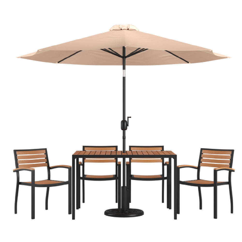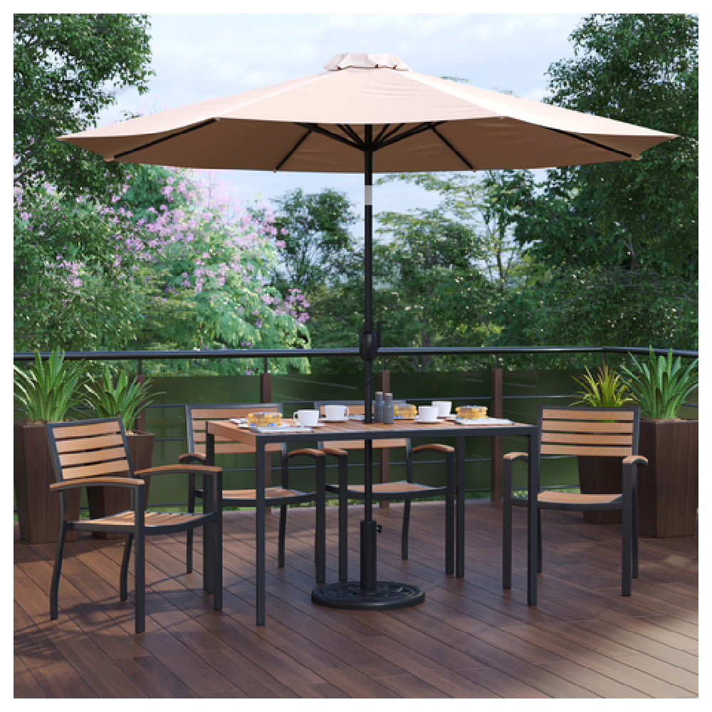 The Flash Furniture XU-DG-304860064-UB19BTN-GG Patio Dining Table Set is a meticulously designed ensemble, perfect for enhancing both residential and commercial outdoor spaces. Central to this set is a rectangular table measuring 48 inches in width and 30 inches in depth, featuring a sophisticated synthetic teak slotted top that combines aesthetic appeal with functional durability. Complementing the table's design is an integrated umbrella hole, offering flexibility for shade on sunny days. The table's robust steel frame ensures long-lasting stability and weather resistance, catering to various climates. Accompanying this are four stacking chairs adorned with teak-accented arms, providing both comfort and style. The set further includes a tan umbrella and a sturdy umbrella base, adding to the comprehensive nature of this outdoor furniture collection. Each component is thoughtfully crafted to meet the needs of different market segments, from homeowners seeking stylish outdoor dining solutions to businesses requiring resilient and functional patio furniture. The Flash Furniture patio dining set harmoniously blends form and function, making it a valuable addition to any outdoor setting.