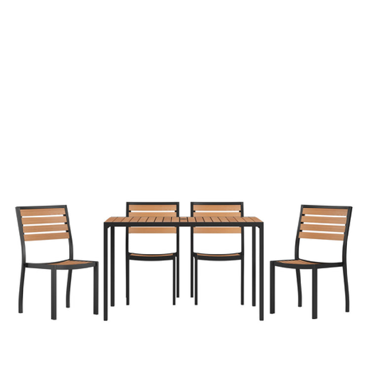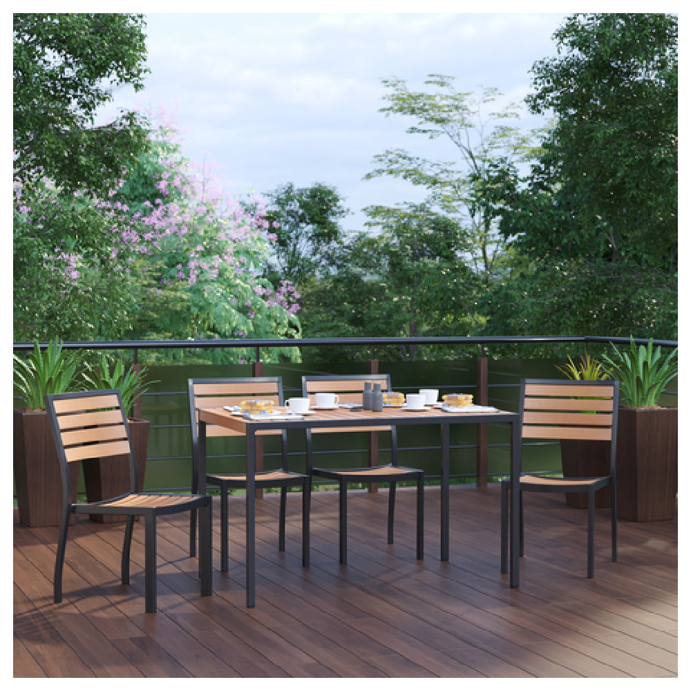 Flash Furniture XU-DG-304860364-GG Patio Dining Table Set is a meticulously designed outdoor furniture ensemble that includes a rectangular table measuring 48 inches wide by 30 inches deep. The table is crafted with a synthetic teak slotted top, offering a stylish and durable surface that is perfect for alfresco dining. An umbrella hole is integrated into the design, providing the option to add shade on sunny days. The steel frame ensures robust support and longevity, making it suitable for various outdoor environments. Accompanying the table are four stacking chairs, designed with faux teak, which complement the table's aesthetic while providing comfortable seating. This set is ideal for homeowners looking to enhance their patio space, as well as businesses in the hospitality industry such as cafes and restaurants seeking to create an inviting outdoor dining area. The combination of synthetic teak and steel materials ensures the set can withstand different weather conditions, while the stackable chairs facilitate easy storage, making it a practical choice for both personal and commercial use. The Flash Furniture XU-DG-304860364-GG set combines functionality with elegance, catering to the diverse needs of its users.