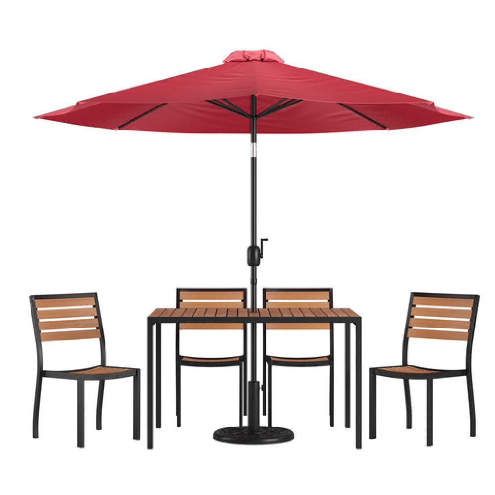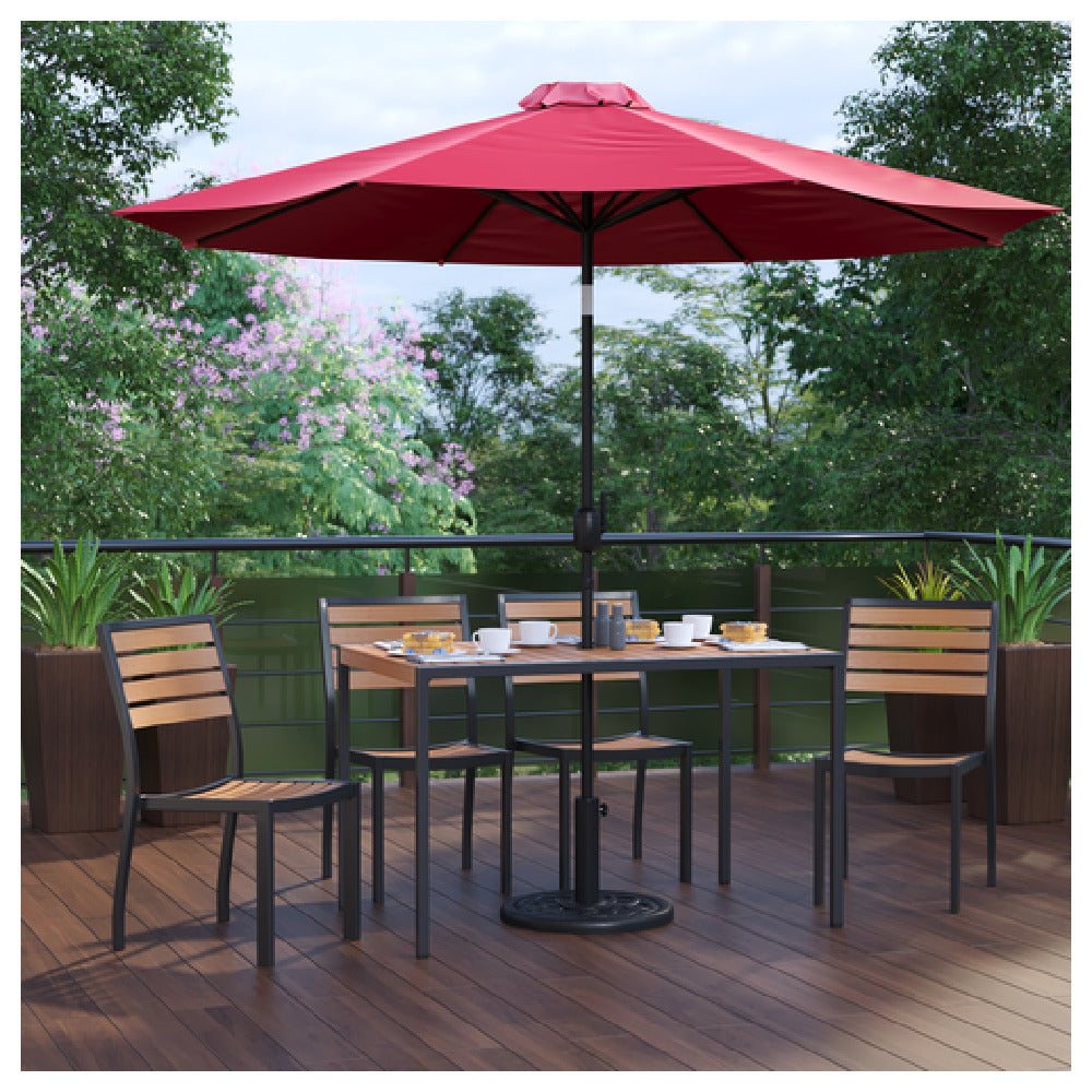 The Flash Furniture XU-DG-304860364-UB19BRD-GG Patio Dining Table Set is a comprehensive outdoor furniture solution designed to enhance both residential and commercial spaces. This set includes a 48"W x 30"D rectangular table, characterized by its synthetic teak slotted top that provides durability and aesthetic appeal. The table is equipped with an umbrella hole to accommodate the included red umbrella, ensuring shade and comfort during outdoor dining experiences. A sturdy steel frame forms the backbone of the table, offering stability and longevity. The set also features an umbrella base to securely hold the umbrella in place. Accompanying the table are four stacking chairs crafted with faux teak, combining style and functionality while allowing for convenient storage when not in use. This patio dining set is particularly appealing to restaurant owners, café operators, and homeowners seeking a blend of modern design and practicality in their outdoor settings. The materials used, such as synthetic and faux teak, ensure resistance to weather elements, making this set an ideal choice for varied outdoor environments. The blend of materials and thoughtful design elements in the Flash Furniture XU-DG-304860364-UB19BRD-GG Patio Dining Table Set offers a versatile and attractive solution for enhancing any outdoor dining experience.