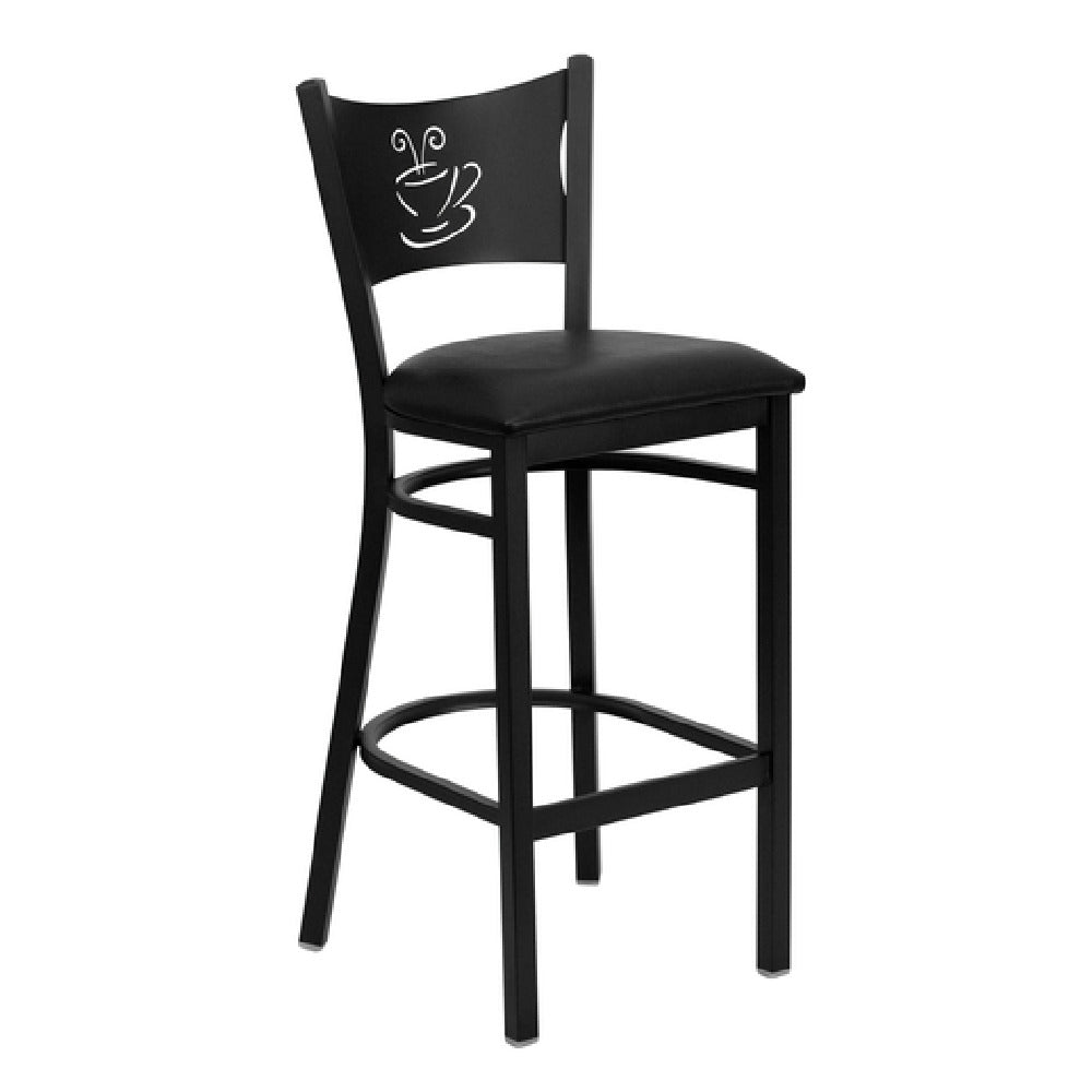 The Flash Furniture XU-DG-60114-COF-BAR-BLKV-GG Hercules Series Restaurant Bar Stool is a premium seating solution designed specifically for commercial environments. This bar stool features a distinctive metal back with a coffee cutout, adding a contemporary aesthetic to any setting. The seat is padded with 2-1/2" thick CA117 fire retardant foam, ensuring both comfort and safety. Upholstered in black vinyl, the seat is not only stylish but also easy to maintain. Structurally, the bar stool boasts an 18-gauge steel black powder-coated frame, providing robust support and durability for heavy use. The welded joint assembly enhances its structural integrity, making it a reliable choice for high-traffic areas. Additionally, the stool is equipped with two curved support bars and a footrest, offering stability and comfort for extended sitting periods. Plastic floor glides protect surfaces from scratches, making this stool suitable for a variety of flooring types. The product is designed with commercial use in mind, requiring some assembly upon delivery. Typically available for quick shipment, it is well-suited for restaurants, bars, and cafes seeking durable and aesthetically pleasing seating solutions that meet industry standards.