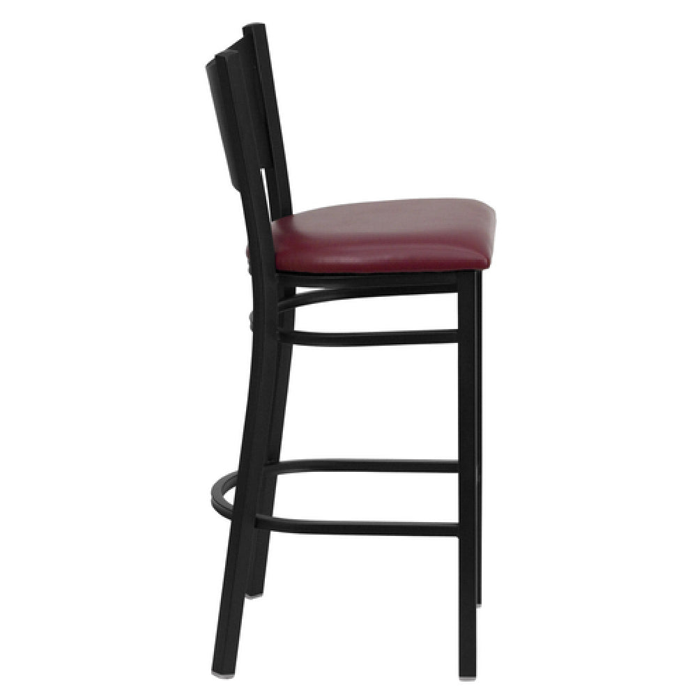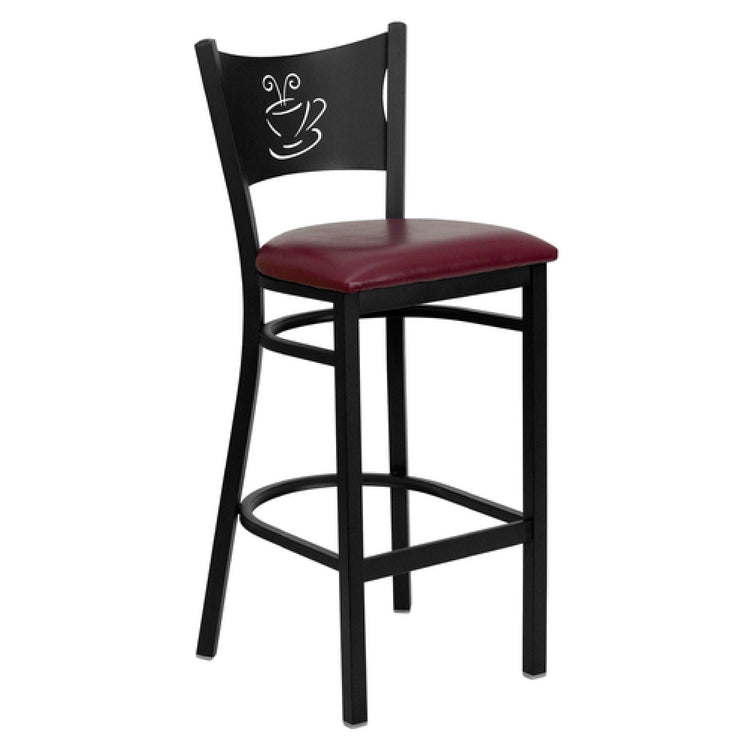 The Flash Furniture XU-DG-60114-COF-BAR-BURV-GG Hercules Series Restaurant Bar Stool is a top-tier seating solution engineered for commercial use, particularly in the restaurant industry. With its distinctive metal back featuring a coffee cutout design, this stool offers both aesthetic appeal and durability. The seat is upholstered in burgundy vinyl and padded with 2-1/2" thick CA117 fire retardant foam, ensuring both comfort and safety. The bar stool's frame is constructed from 18-gauge steel, finished with a black powder coating for enhanced resilience and longevity. This robust design is further reinforced with welded joint assembly and two curved support bars. A footrest is integrated for added comfort, while plastic floor glides protect flooring surfaces. The design requires assembly and is tailored to withstand the demands of commercial environments. Ideal for restaurateurs seeking reliable, stylish, and safe seating options, this bar stool combines practical features with a sleek, modern look. Ready to meet the needs of high-traffic areas, this product ships swiftly, with most in-stock items dispatched within 24 hours, a testament to its readiness for immediate deployment in bustling dining settings.