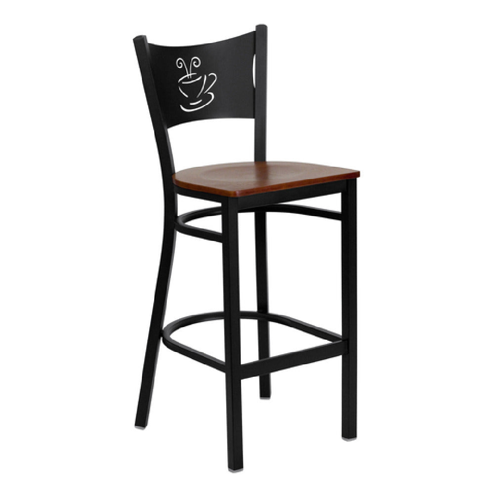 The Flash Furniture XU-DG-60114-COF-BAR-CHYW-GG Hercules Series Restaurant Bar Stool is a premium seating solution designed for commercial environments. This bar stool combines durability and aesthetic appeal with its metal back featuring a unique coffee cutout design. The seat is crafted from 5/8-inch thick cherry finish plywood, offering a stylish yet robust platform for users. Structurally, the stool is reinforced with a welded joint assembly and two curved support bars, ensuring stability under frequent use. The inclusion of a footrest enhances user comfort, making it suitable for extended periods of sitting. The frame is constructed from 18-gauge steel and finished with a black powder coating, providing both strength and a sleek appearance. Plastic floor glides are incorporated to protect flooring, making it a practical choice for high-traffic commercial settings. This bar stool is a versatile addition to restaurants, cafes, or bars, where its blend of durability and design can complement diverse interior aesthetics. Although assembly is required, its in-stock status ensures swift shipping, typically within 24 hours, making it a convenient option for businesses seeking reliable and attractive seating solutions.