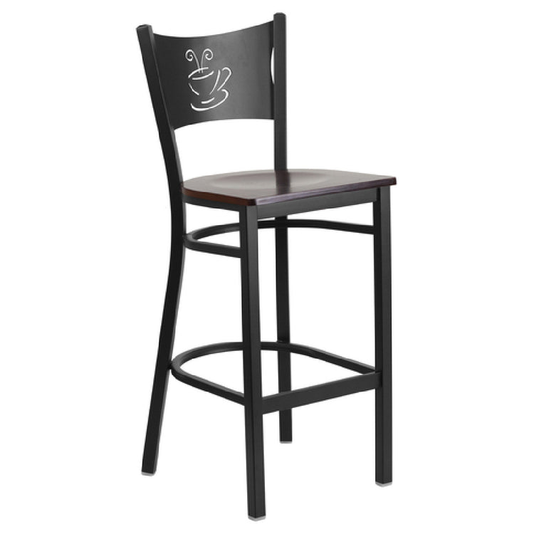The Flash Furniture XU-DG-60114-COF-BAR-WALW-GG Hercules Series Restaurant Bar Stool is a meticulously designed seating option tailored for commercial spaces. Featuring a metal back with a distinctive coffee cutout, this bar stool seamlessly combines style with functionality. The 5/8-inch thick walnut finish plywood seat offers a robust and comfortable seating surface that complements various dining settings. Its welded joint assembly enhances structural integrity, ensuring durability and longevity for high-traffic environments. The stool incorporates two curved support bars, providing added stability, along with a convenient footrest for user comfort. With an 18-gauge steel black powder-coated frame, this bar stool promises resilience and a sleek appearance. Its plastic floor glides protect flooring surfaces, making it suitable for diverse venues, including bars, cafes, and restaurants. Designed specifically for commercial use, the Hercules Series Bar Stool requires assembly but typically ships within 24 hours when in stock. This product stands out as a versatile and reliable choice for industry professionals seeking both aesthetic appeal and sturdy construction in their seating solutions.