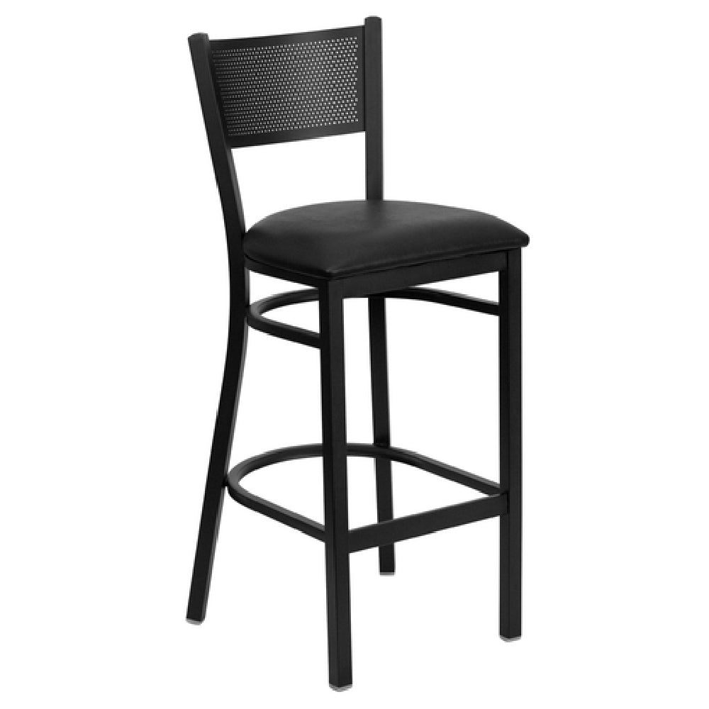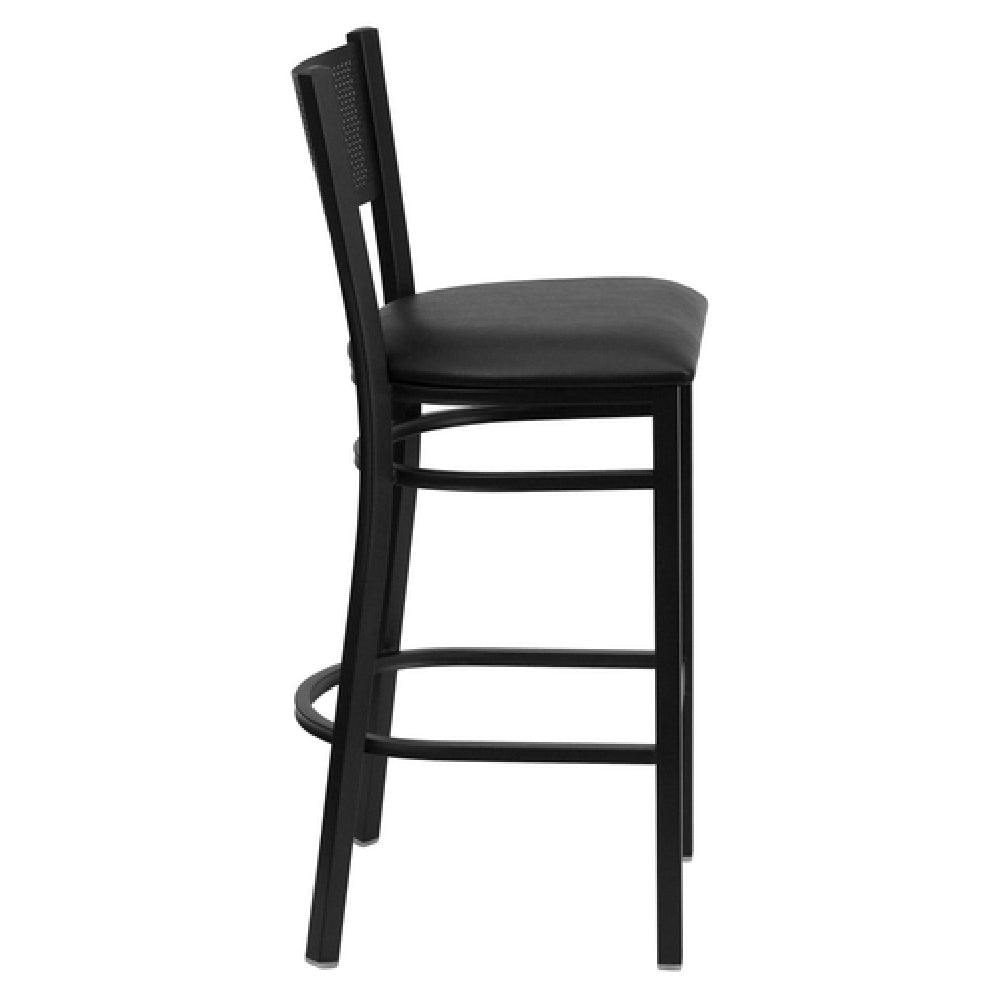 The Flash Furniture XU-DG-60116-GRD-BAR-BLKV-GG Hercules Series Restaurant Bar Stool is a versatile seating solution designed for commercial applications. Featuring a sturdy metal back with a grid design, this bar stool combines durability with aesthetic appeal. The seat is upholstered in black vinyl and padded with a 2-1/2" thick CA117 fire retardant foam, ensuring both comfort and safety. The stool's construction includes a welded joint assembly and two curved support bars, which contribute to its robust build. Additionally, the footrest enhances user comfort during prolonged seating. Crafted from 18-gauge steel, the black powder-coated frame not only adds to the stool's longevity but also complements various interior styles. The inclusion of plastic floor glides protects flooring surfaces, making this stool practical for high-traffic environments. While it requires assembly, the stool's readiness for shipping within 24 hours of order makes it a convenient choice for businesses aiming to enhance their seating arrangements promptly. The Flash Furniture Hercules Series Restaurant Bar Stool effectively meets the needs of restaurants, cafes, and bars, offering a blend of style, comfort, and durability.