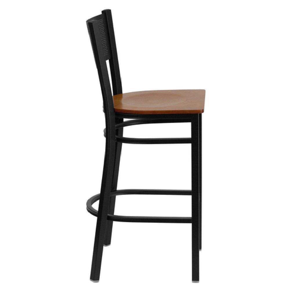 The Flash Furniture XU-DG-60116-GRD-BAR-CHYW-GG Hercules Series Restaurant Barstool is engineered for durability and style, making it a valuable addition to any commercial dining environment. This barstool features a metal back with a grid design that adds a modern flair while ensuring structural integrity. The seat is crafted from 5/8-inch thick cherry finish plywood, providing both aesthetic appeal and comfort for users. It boasts a welded joint assembly, enhancing the stool's strength and longevity, suitable for heavy-duty commercial use. The design incorporates two curved support bars and a footrest, offering additional stability and comfort. Constructed with an 18-gauge steel frame, it is finished with a black powder coating, ensuring resistance to wear and maintaining its sleek appearance over time. Plastic floor glides are included to protect flooring surfaces and ensure ease of movement. Designed specifically for commercial use, this barstool requires assembly. With most items in stock shipping within 24 hours, the Flash Furniture XU-DG-60116-GRD-BAR-CHYW-GG Hercules Series Restaurant Barstool is an efficient choice for restaurant owners seeking a reliable and stylish seating solution. This product's robust construction and thoughtful design make it ideal for restaurant, bar, or cafe settings.