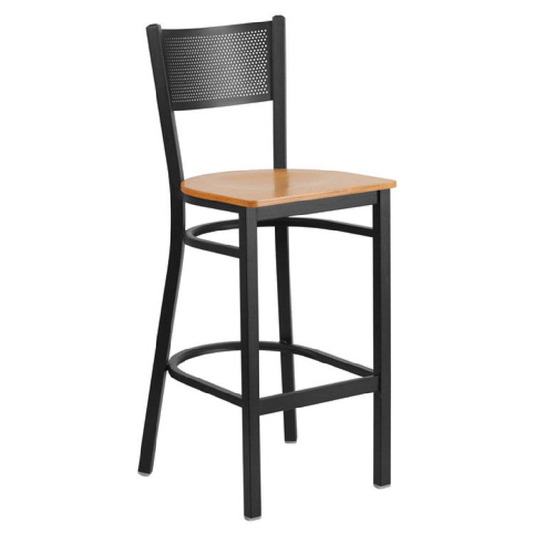 The Flash Furniture XU-DG-60116-GRD-BAR-NATW-GG Hercules Series Restaurant Barstool is a meticulously designed seating solution ideal for both commercial and hospitality settings. This barstool features a sturdy metal back with a grid design, providing both aesthetic appeal and robust support. The 5/8-inch thick natural finish plywood seat adds an element of sophistication while ensuring durability. Its welded joint assembly and two curved support bars enhance stability, making it a reliable choice for high-traffic environments. The integrated footrest offers additional comfort, catering to patrons seeking a relaxed seating experience. Constructed with an 18-gauge steel frame, finished with a black powder coating, this barstool is designed to withstand the rigors of daily use. The inclusion of plastic floor glides ensures that flooring remains protected from scratches or damage, making it suitable for a variety of surfaces. Designed specifically for commercial use, this barstool requires assembly, but its robust features ensure longevity and resilience. Typically, in-stock items ship within 24 hours, offering a quick turnaround for establishments needing to furnish their spaces promptly. The Flash Furniture Hercules Series Restaurant Barstool is a perfect blend of functionality and style, making it a versatile choice for diverse market segments within the restaurant and hospitality industry.
