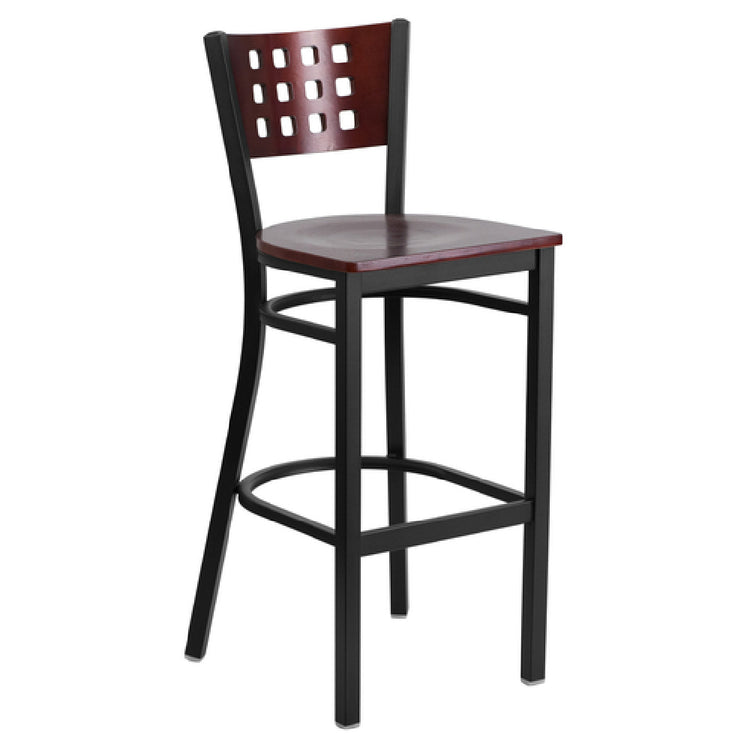 The Flash Furniture XU-DG-60118-MAH-BAR-MTL-GG Hercules Series Restaurant Bar Stool stands as a versatile seating solution, crafted to meet the rigorous demands of commercial environments. With a mahogany finish, the plywood back showcases 12 square cutouts, offering a blend of aesthetic appeal and functional design. The seat, also featuring a mahogany finish, is 5/8 inches thick, providing comfort and durability for prolonged use. Constructed with a welded joint assembly, this stool ensures stability and longevity, augmented by the presence of two curved support bars. The integrated footrest further enhances user comfort. The frame, made of 18-gauge steel, is finished with a black powder coating, combining strength with a sleek, modern look. Plastic floor glides are included, protecting flooring surfaces and facilitating easy movement. Specifically designed for commercial use, this bar stool requires assembly, yet its quality construction promises quick setup, with in-stock items typically shipping within 24 hours. This product is ideal for restaurant and bar environments seeking reliable and stylish seating options that withstand high-traffic areas while maintaining a sophisticated appearance.