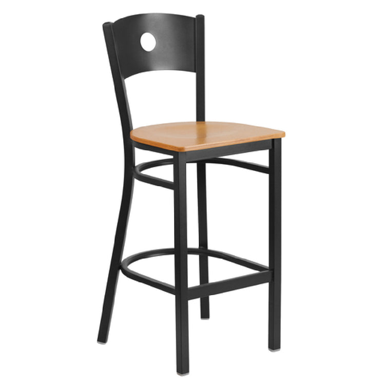 The Flash Furniture XU-DG-60120-CIR-BAR-NATW-GG Hercules Series Restaurant Bar Stool is a meticulously designed seating solution that blends strength and style, tailored for commercial use. Featuring a metal back with a distinctive circle cutout, this bar stool stands out in any restaurant setting. The seat is crafted from a 5/8-inch thick natural finish plywood, providing both durability and aesthetic appeal. Its welded joint assembly ensures stability, supported by two curved support bars that enhance its structural integrity. Additionally, a footrest is incorporated for added comfort. The frame is constructed from 18-gauge steel and finished with a black powder coating, offering a sleek look while being resilient to wear and tear. Plastic floor glides are included to protect flooring surfaces from scratches. This bar stool requires assembly, but its robust design guarantees long-lasting performance. With in-stock items typically shipping within 24 hours, the Flash Furniture Hercules Series Restaurant Bar Stool is an ideal choice for businesses seeking reliable and stylish seating options in high-traffic environments like bars, cafes, and restaurants. Its combination of functionality and design makes it a valuable addition to any commercial space that prioritizes both form and function.