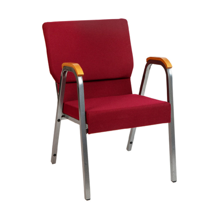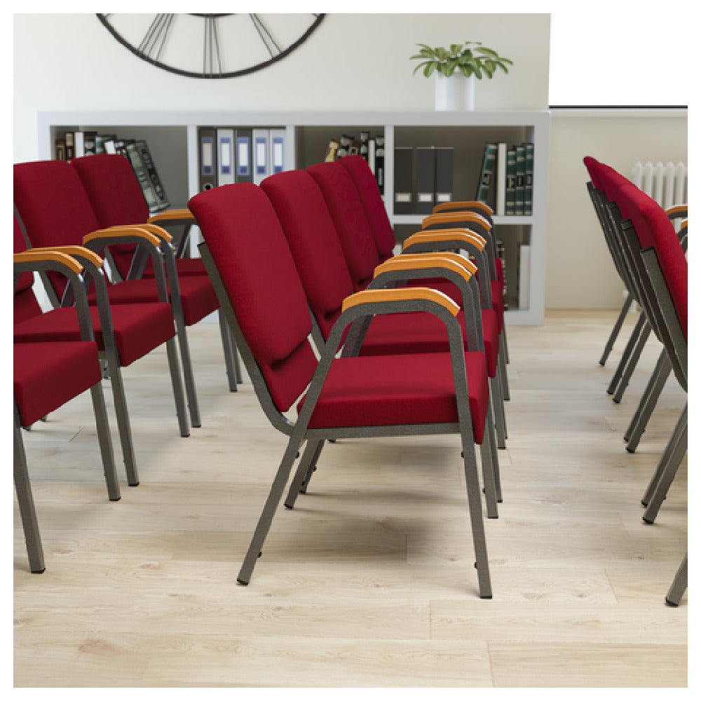 The Flash Furniture XU-DG-60156-BUR-GG Hercules Series Arm Chair 21"W Stackable is a versatile seating solution designed for both functionality and style, ideal for various settings such as conference rooms, training areas, and dining establishments. With a 21-inch width, this chair provides ample seating space, ensuring comfort for extended periods. The chair features fabric upholstery in a rich burgundy hue, adding a touch of elegance to any environment. Integrated wood accent arms enhance the aesthetic appeal while offering additional support and comfort. Its silver vein steel frame not only ensures durability but also supports easy stacking, making it a practical choice for spaces where flexible seating arrangements are required. The stackable design facilitates efficient storage, enabling quick and convenient reconfiguration of seating layouts to accommodate different group sizes or functions. Designed with attention to both form and function, the Flash Furniture Hercules Series Arm Chair is an excellent choice for facilities seeking reliable and stylish seating options that can adapt to a variety of uses within the industry.